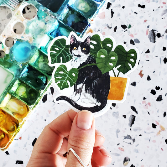 Cat and Plant Sticker 16 - Tuxedo Cat with Monstera