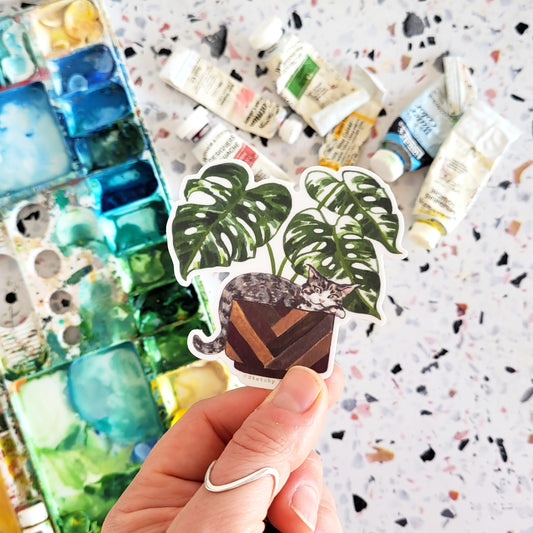 Cat and Plant Sticker 15 - Tabby Cat with Variegated Monstera
