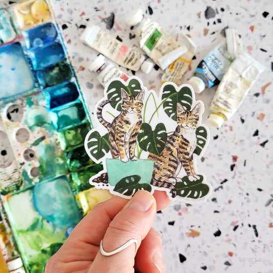 Cat and Plant Sticker 14 - Torbie Cats with Monstera