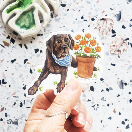 Tiny Dog and Flower Sticker 4 - Chocolate Lab with Marigolds