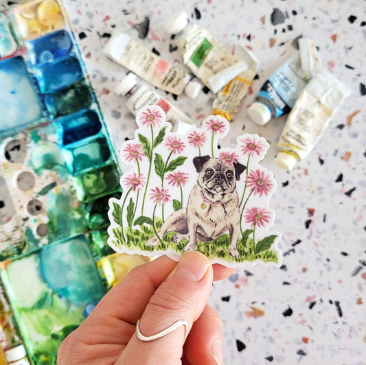 Tiny Dog and Flower Sticker 6 - Pug with Gerber Daisies