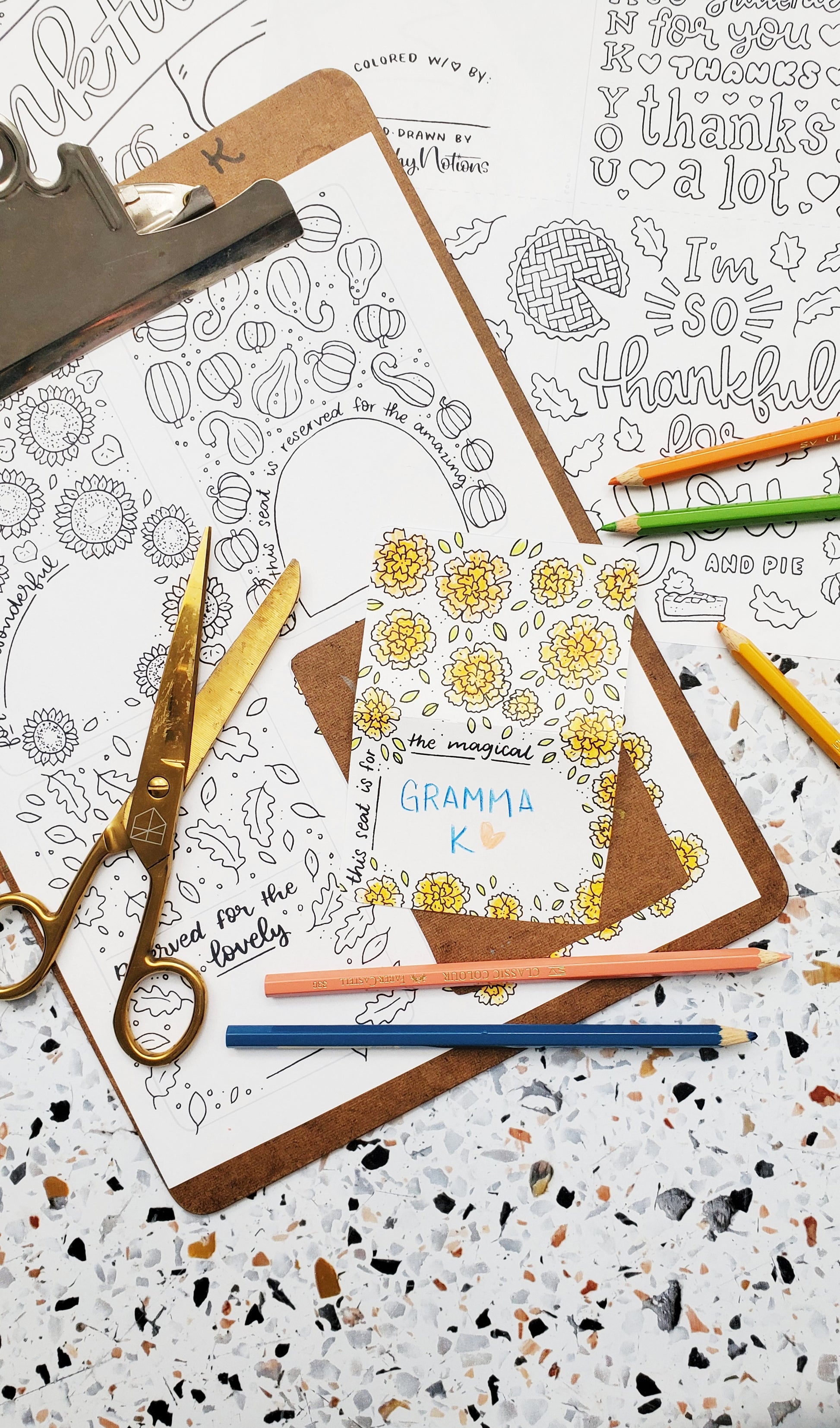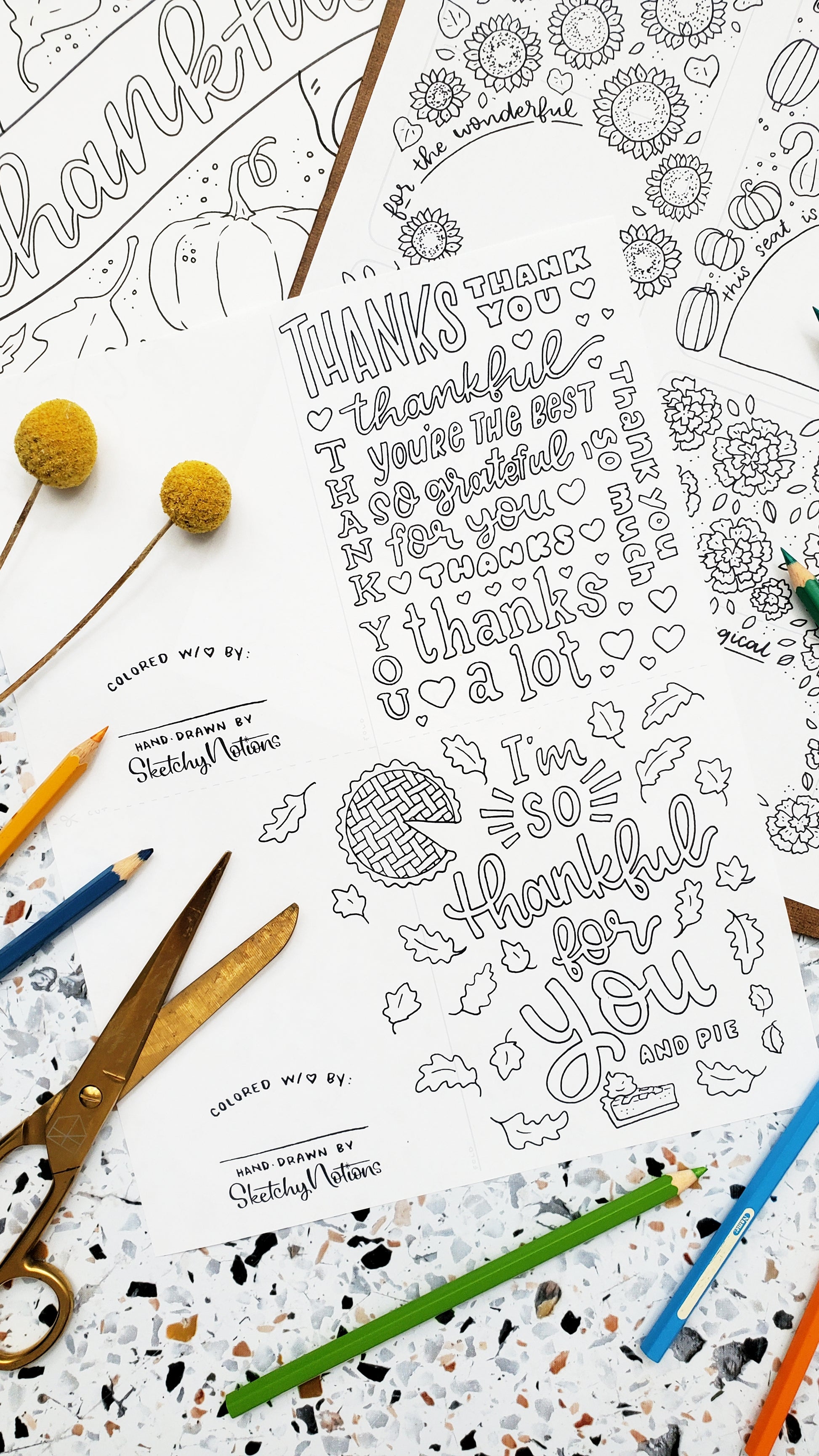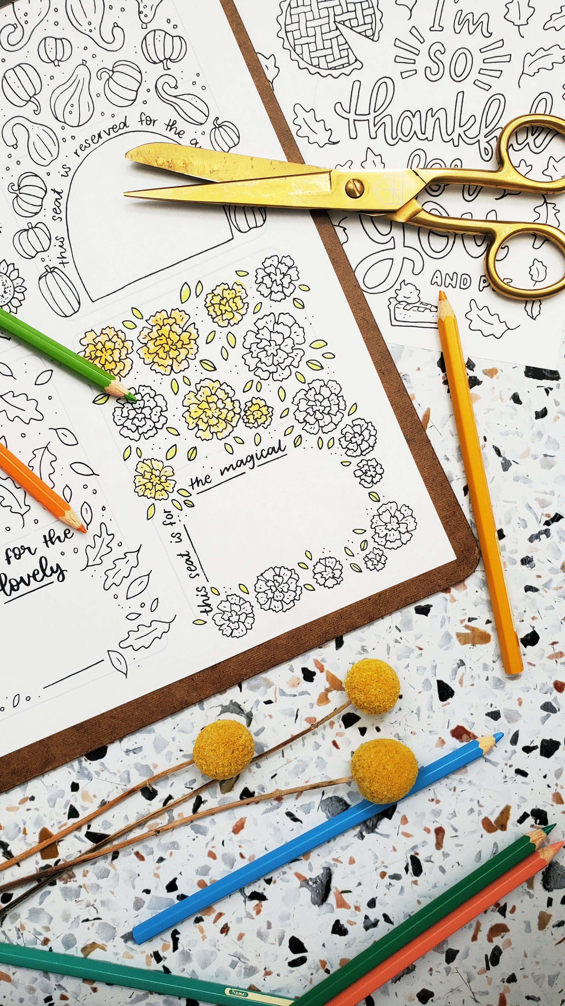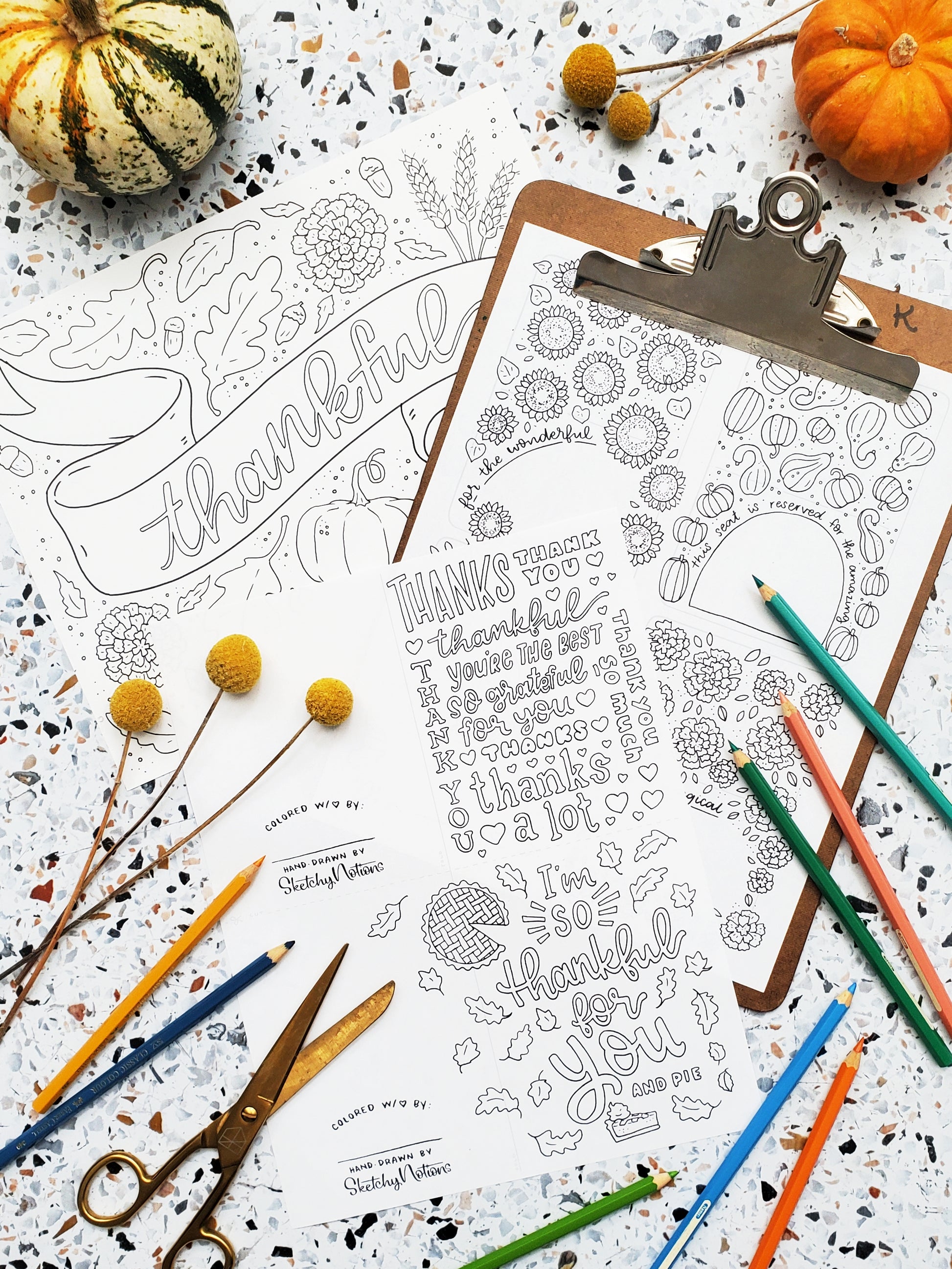 Decorate your Thanksgiving table with this set of coloring pages! Or give yourself a break on a busy day by giving the kiddos the chance to color and decorate. When I was little my favorite task my mom gave us was making placemats for everyone at Thanksgiving!