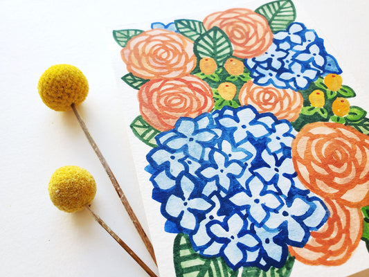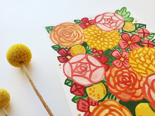 Floral Collage Peonies & Billy Buttons Original Watercolor