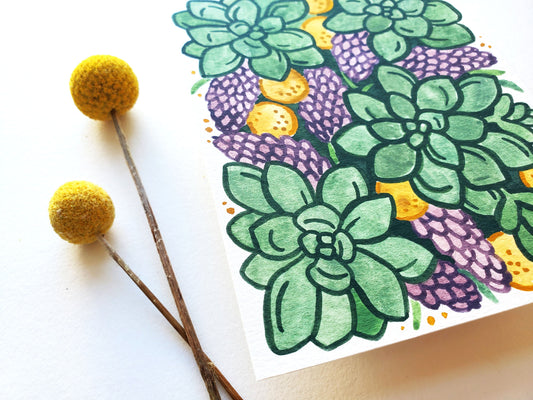 Floral Collage Succulents & Billy Buttons Original Watercolor