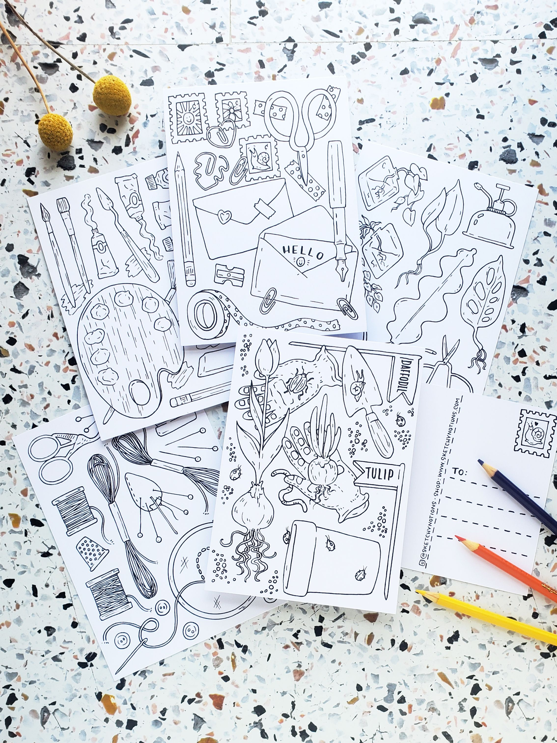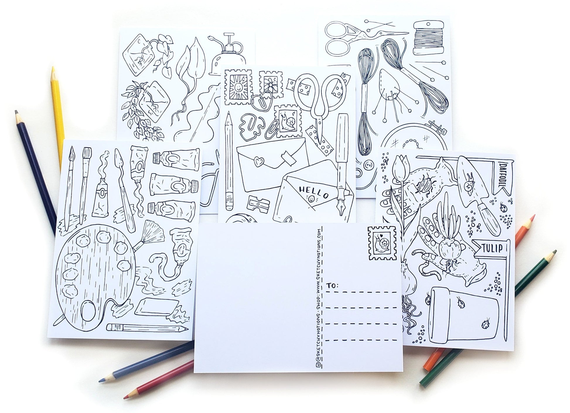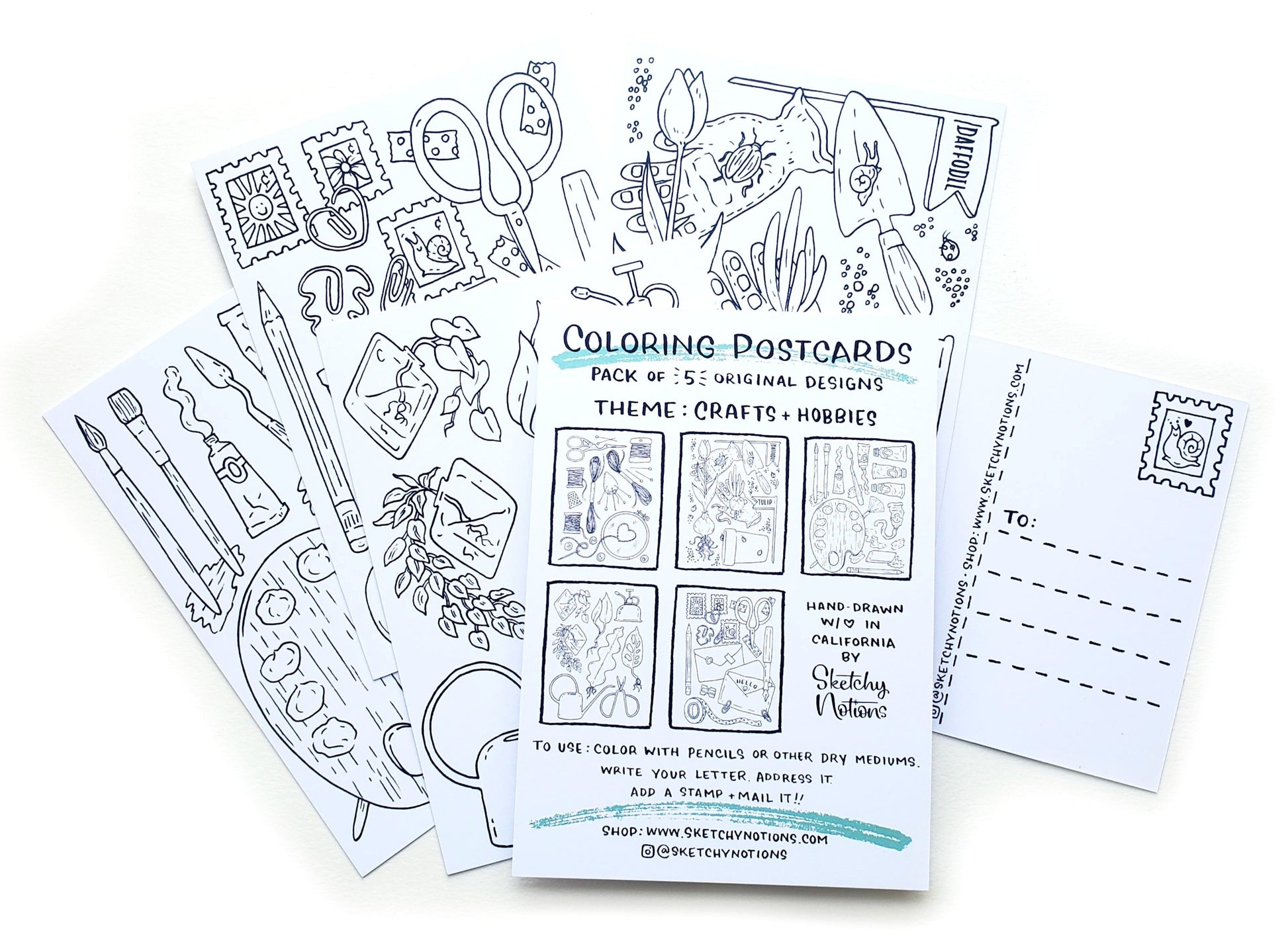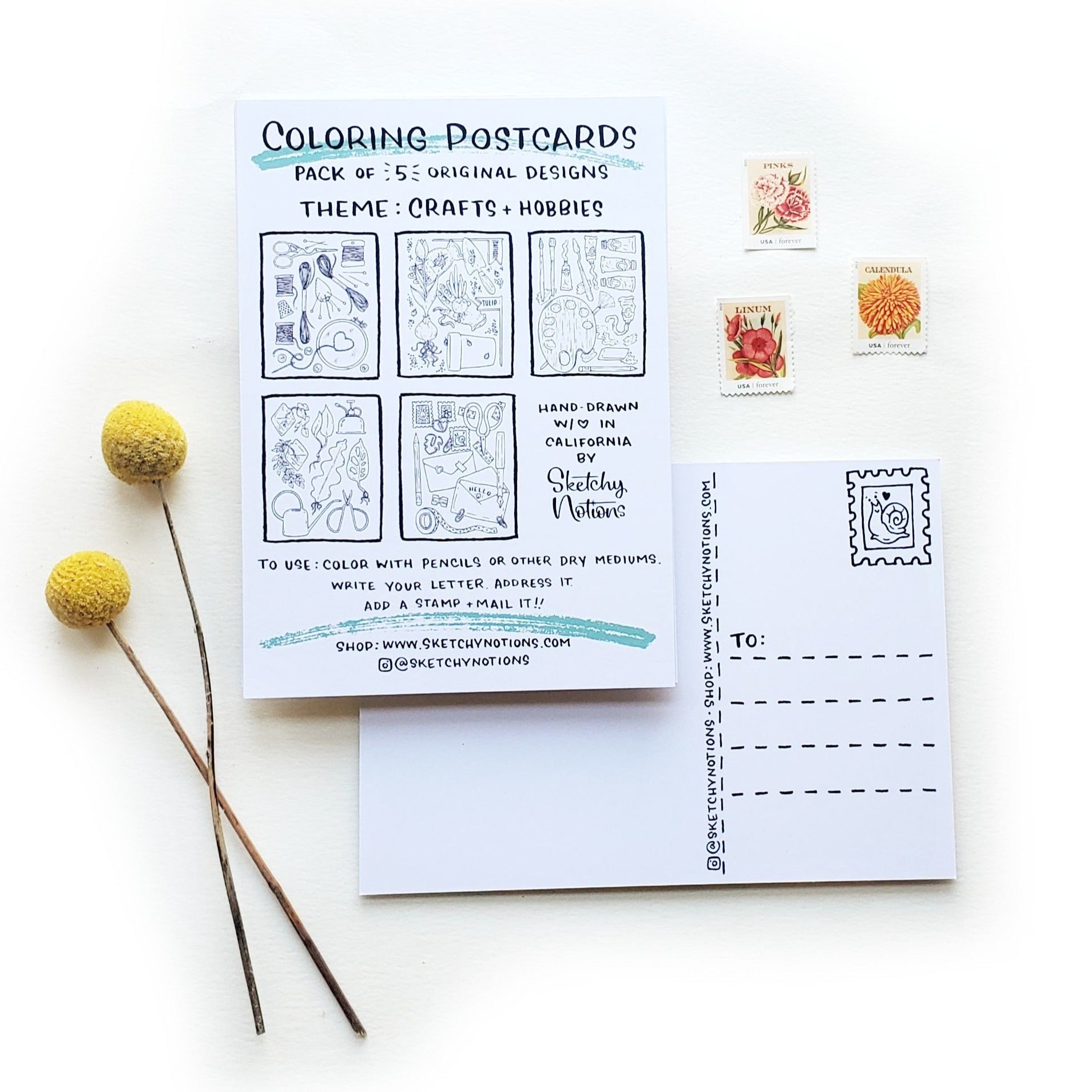 Color up your crafty world with these Craft + Hobby themed Coloring Postcards! Our mail-ready cards feature hand-drawn illustrations for all sorts of fun hobbies, from painting and gardening, to sewing and baking. Get creative with your correspondence and express your crafty side! Mail them a postcard you colored yourself, or send it blank for them to color!