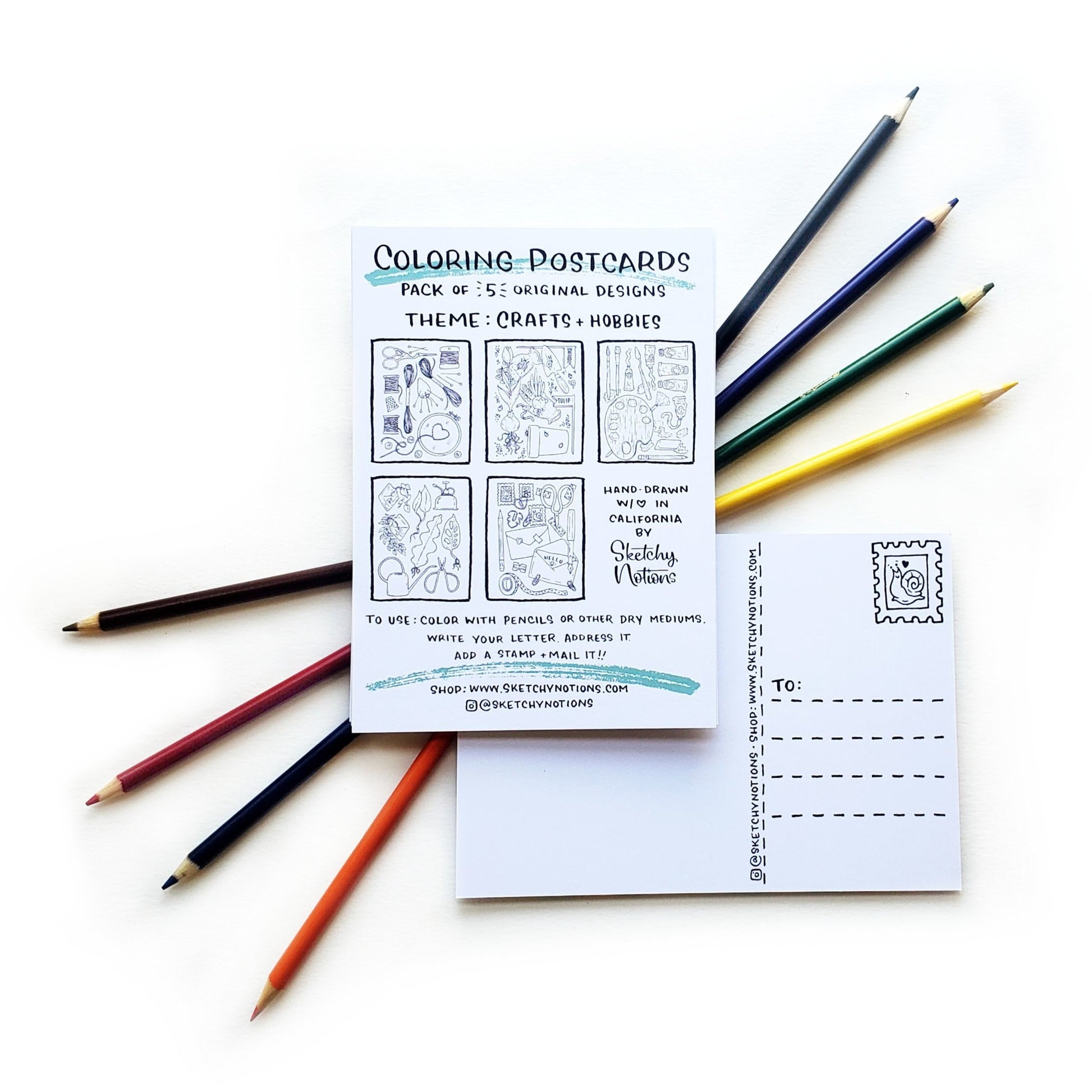 - Postcards are printed on heavy paper. While they can hold watercolor paints and marker ink, just know the ink from the designs may bleed! Colored pencils and crayons work best for coloring.