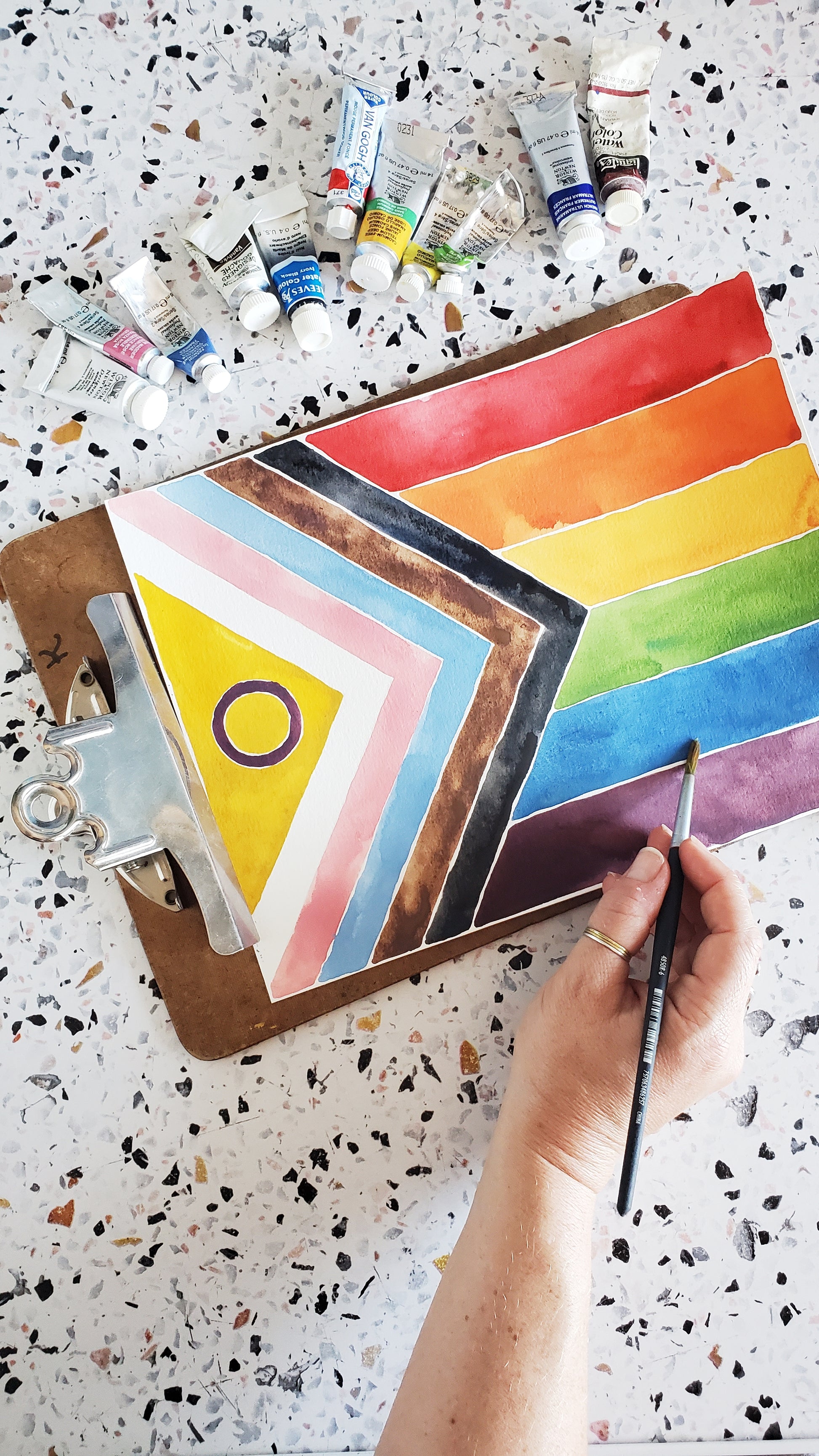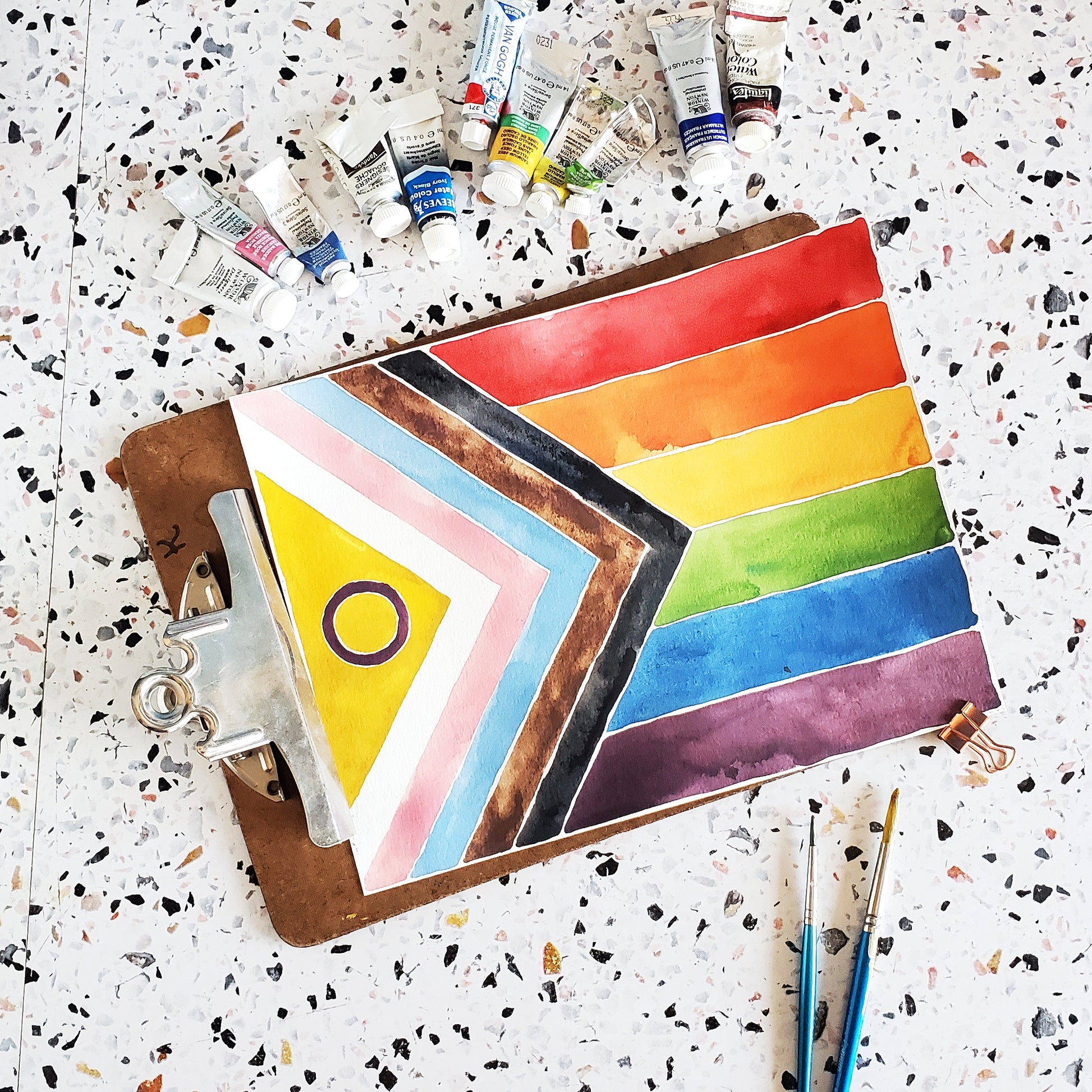 Show your support for the LGBTQ+ community with this free download of the Progress Pride flag 2021 version. This print was watercolored by hand and is available for free for anyone who wants to show their solidarity and support. Or buy the paid version, proceeds are donated to the Trevor Project.