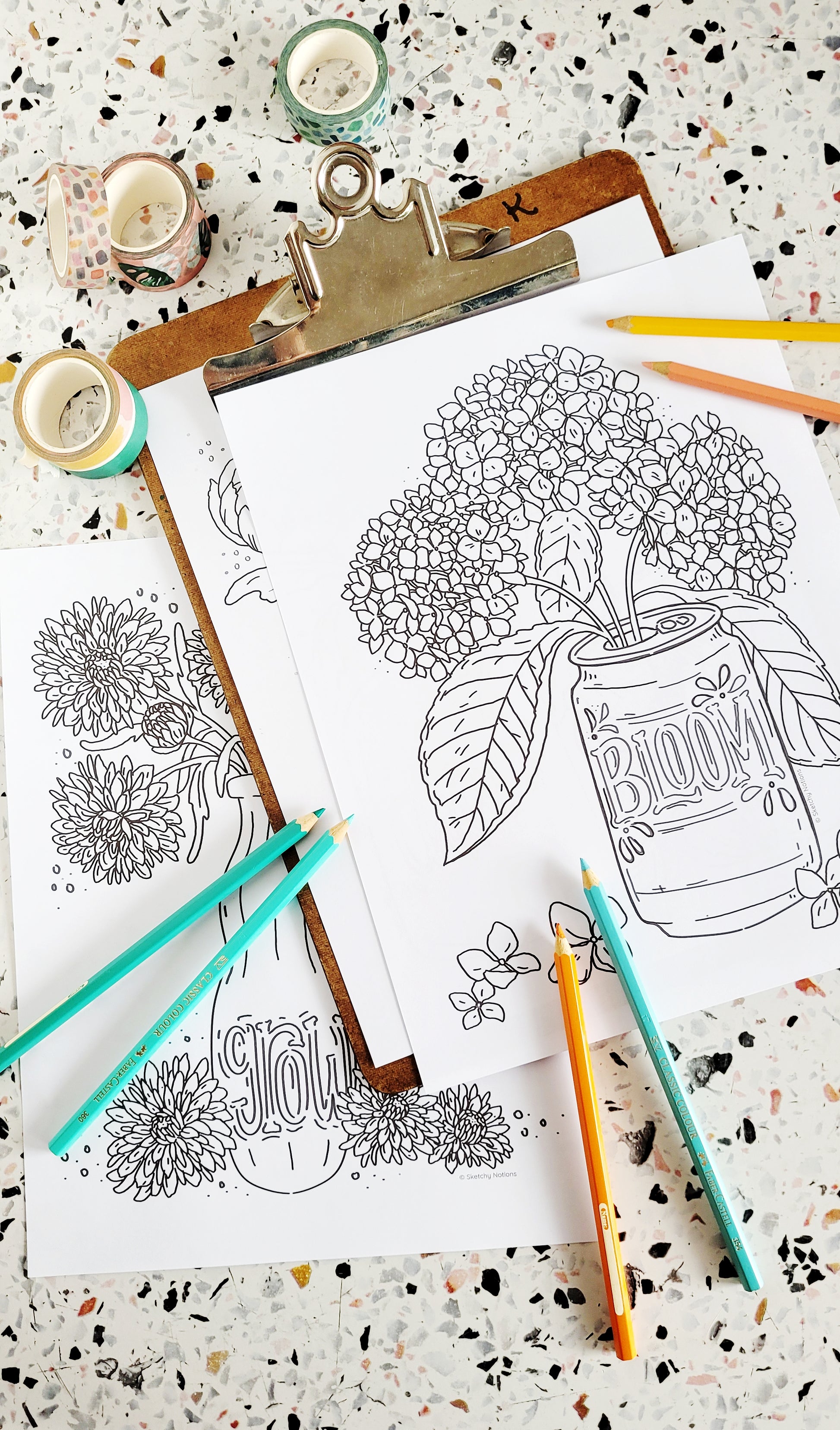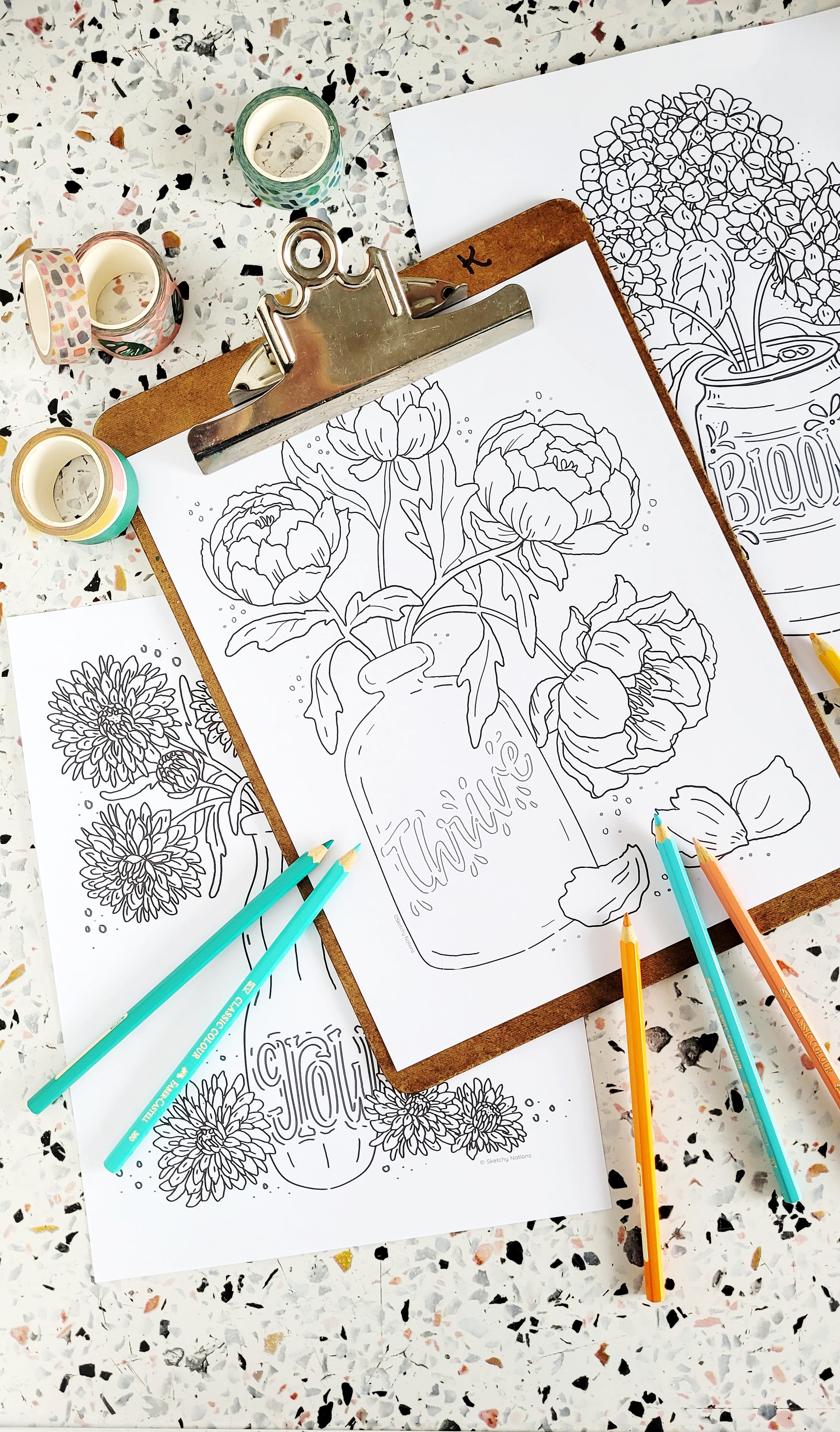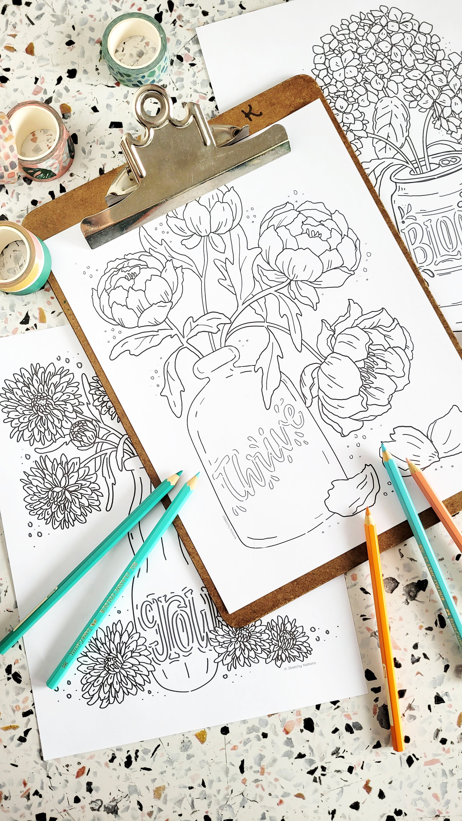 Want more floral and good vibe themed pages? Check out our Spring Flowers and Colorful Optimism! OR sign up for our monthly newsletter and get these pages for free!
