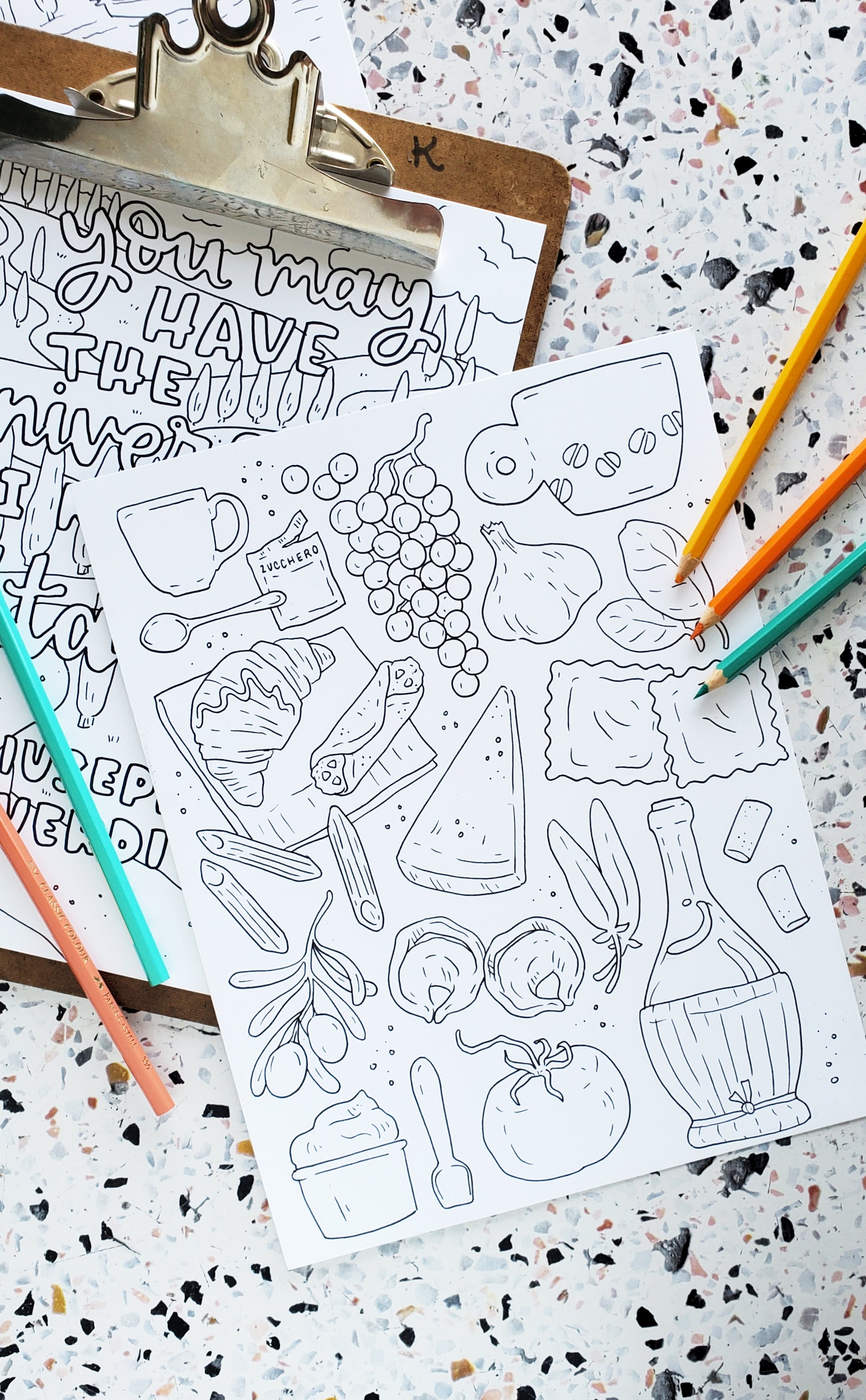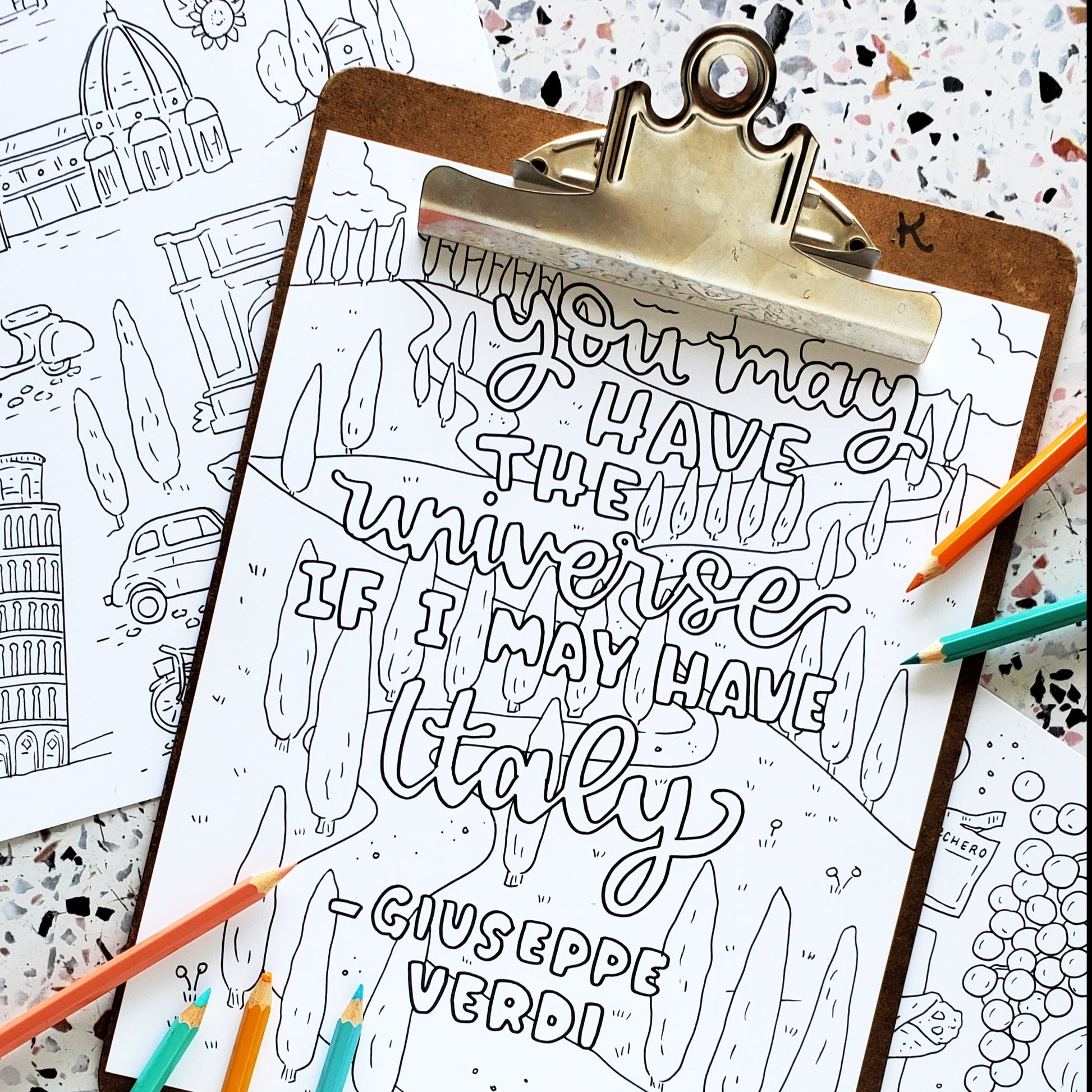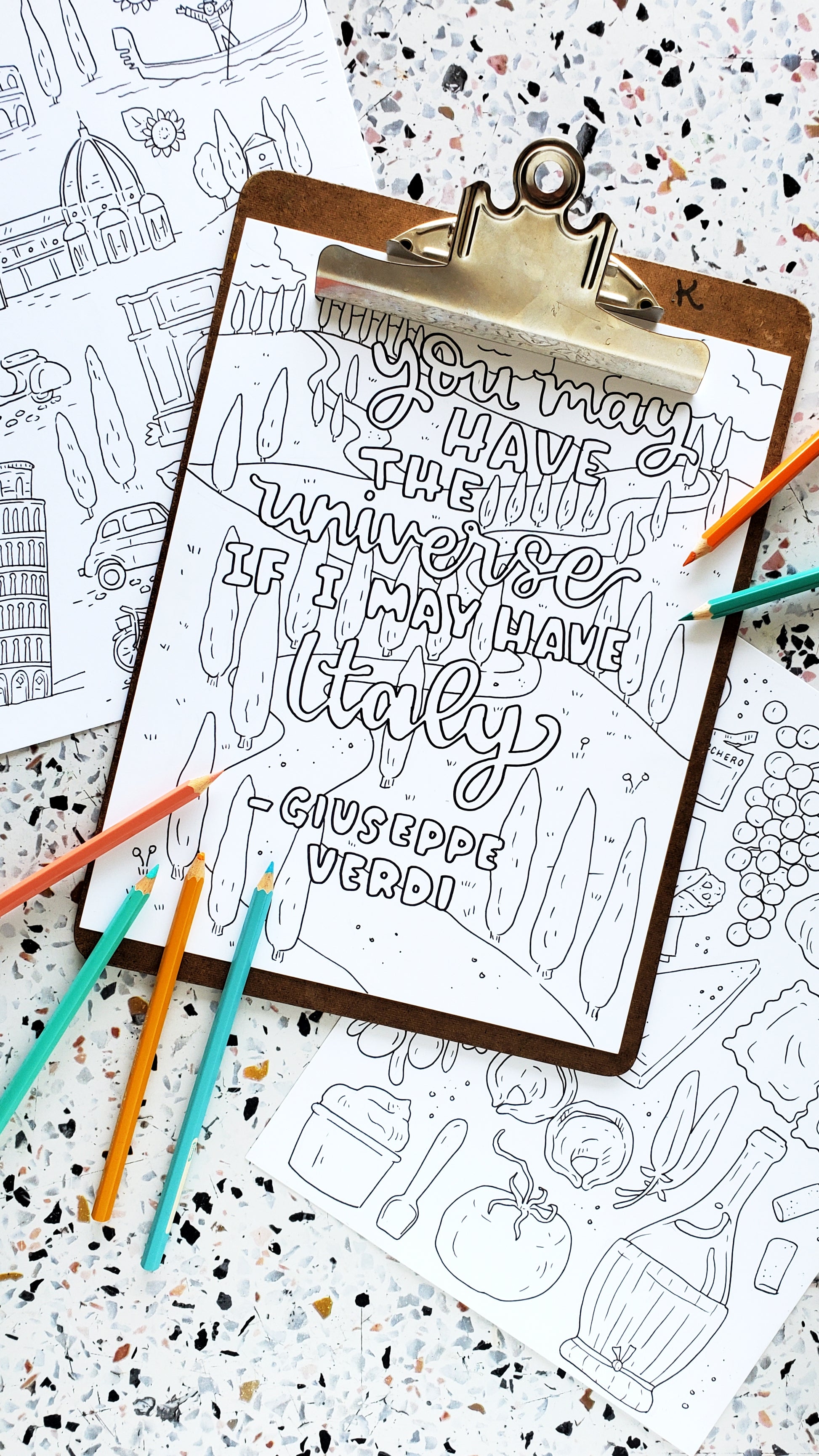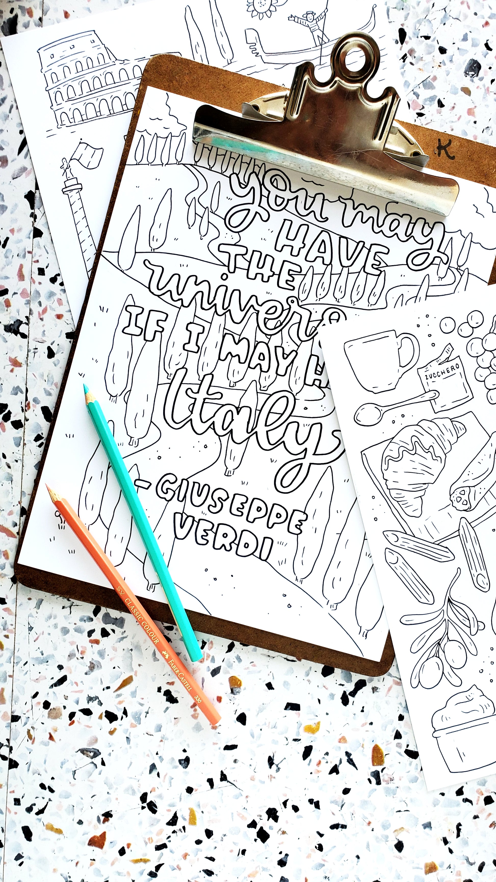 Ciao bella! Give yourself a colorful break with this Italy themed set of coloring pages! This set includes three unique pages, including: a lovely quote about Italia, a page of tasty treats and a third of famous sites and monuments throughout Italy!