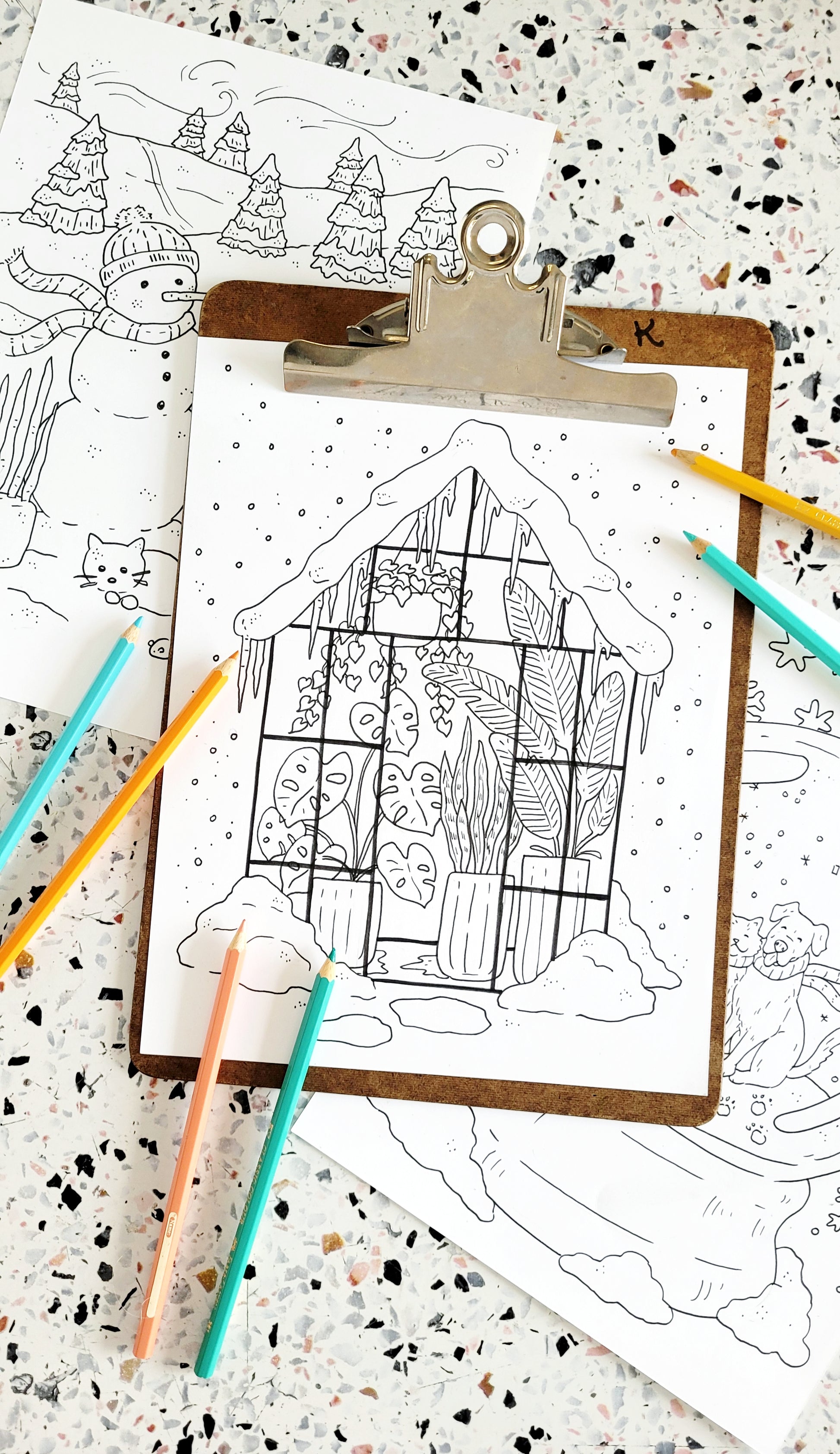 Give yourself a colorful break with these winter wonderland themed coloring pages! It's a snowy set...with a plant and cat loving twist! This set of hand-drawn illustrations includes designs with a snow covered greenhouse, a furry snow globe and some unique snow-cats and a snow plant person (complete with an icicle snake plant).