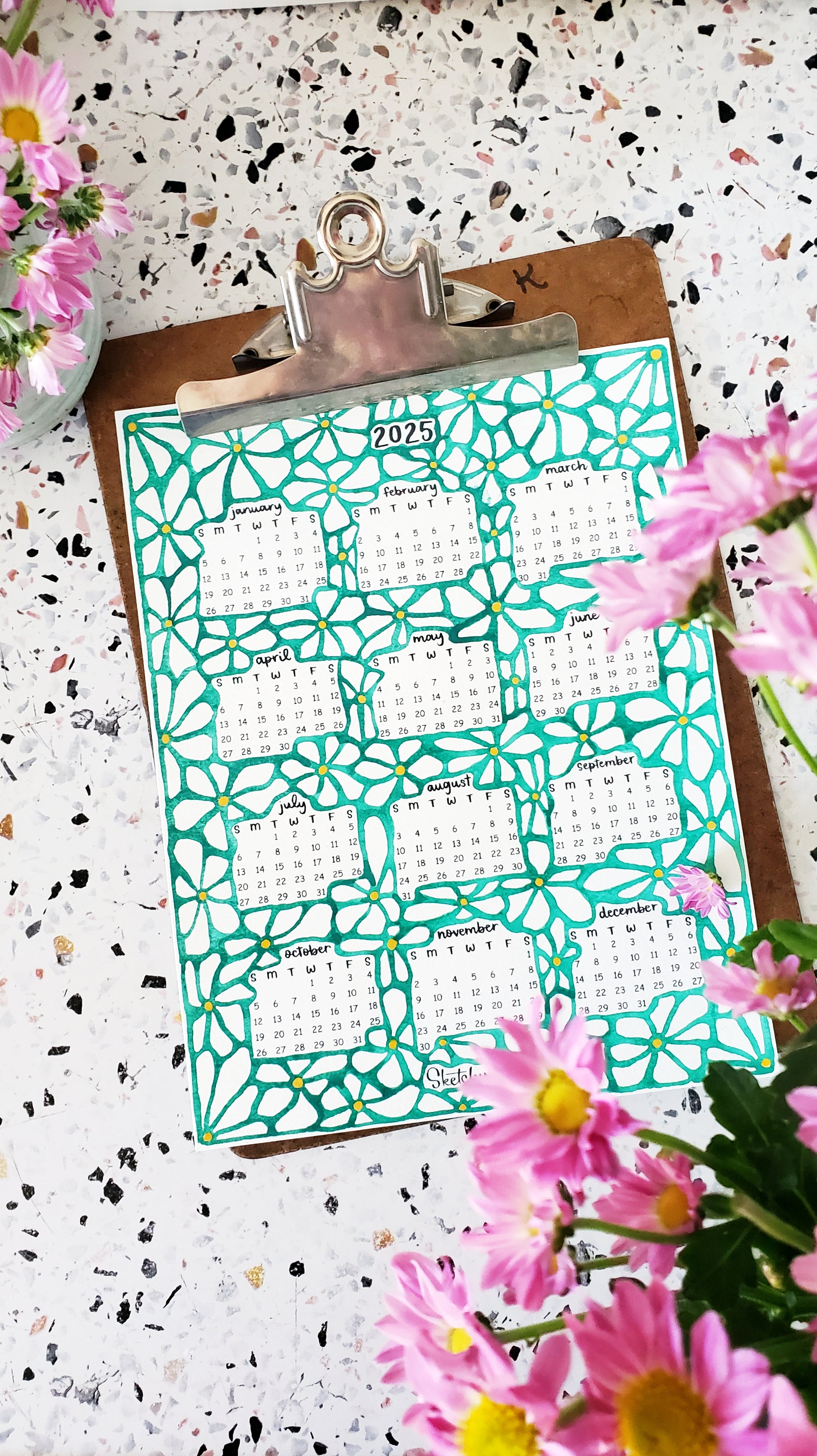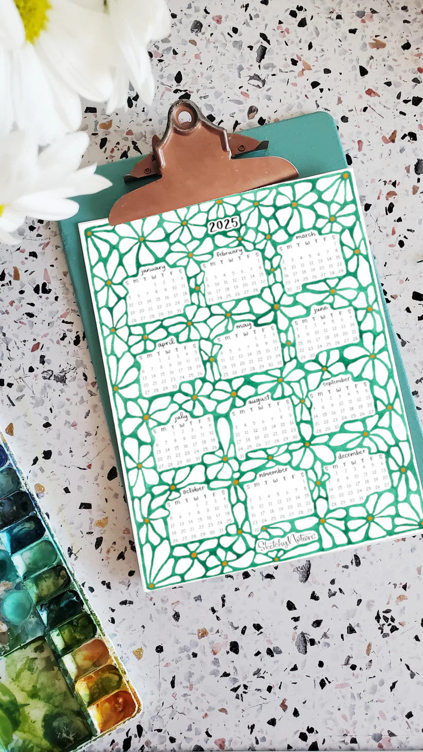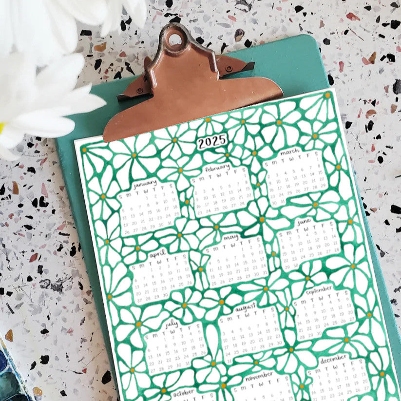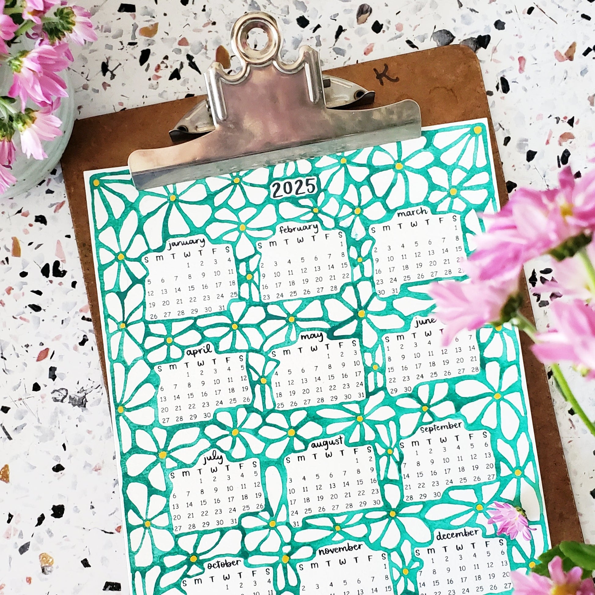 Stay on top of 2025 with 2025 Tiny Disco Daisies Calendar. Add some funk to your organization with our teal flower print and watercolor illustrations. Download and print at home for instant calendar fun.