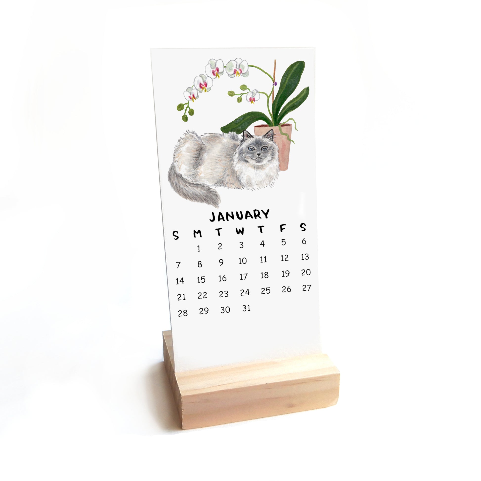 This calendar features original watercolor illustrations of some of our favorite cats and plants. Many of the cats featured belong to friends of ours. Each cat has its own personality and is paired with a fun house plant. It's the perfect calendar for the cat person in your life, or for yourself! It's also small enough to fit on your desk to cheer you up throughout your work day.