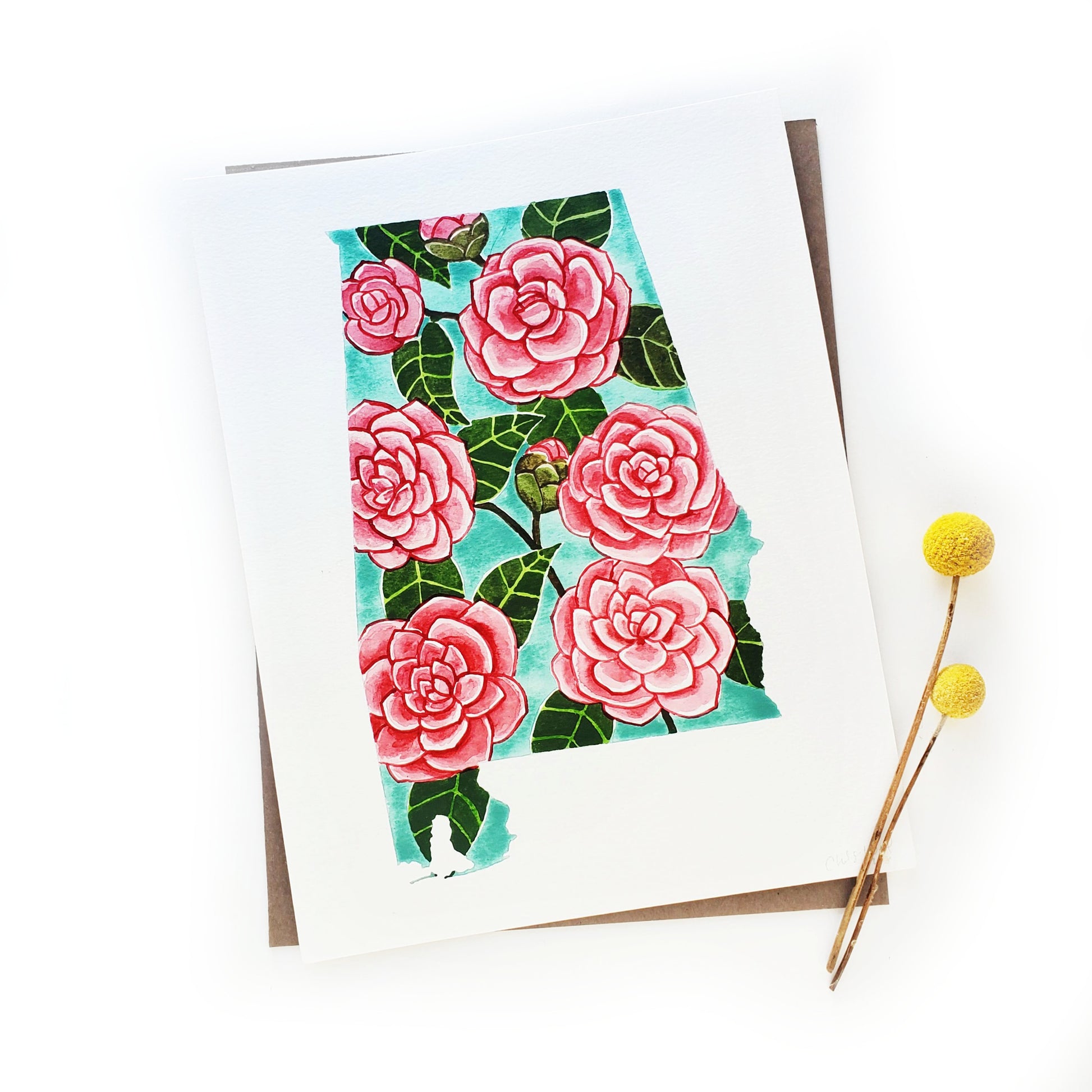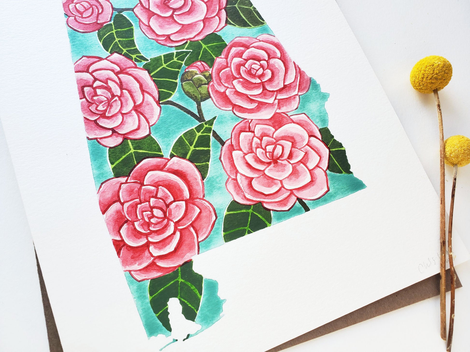 Discover the beauty of Alabama’s lush and vibrant state flower with this original watercolor art! Whether you’re a born ‘n bred Cotton State native or just passing through, this gorgeous painting of a camellia flower will be sure to bring a little sunshine to your home. Enjoy the beauty of the Camellia flower, aka the state flower of Alabama!