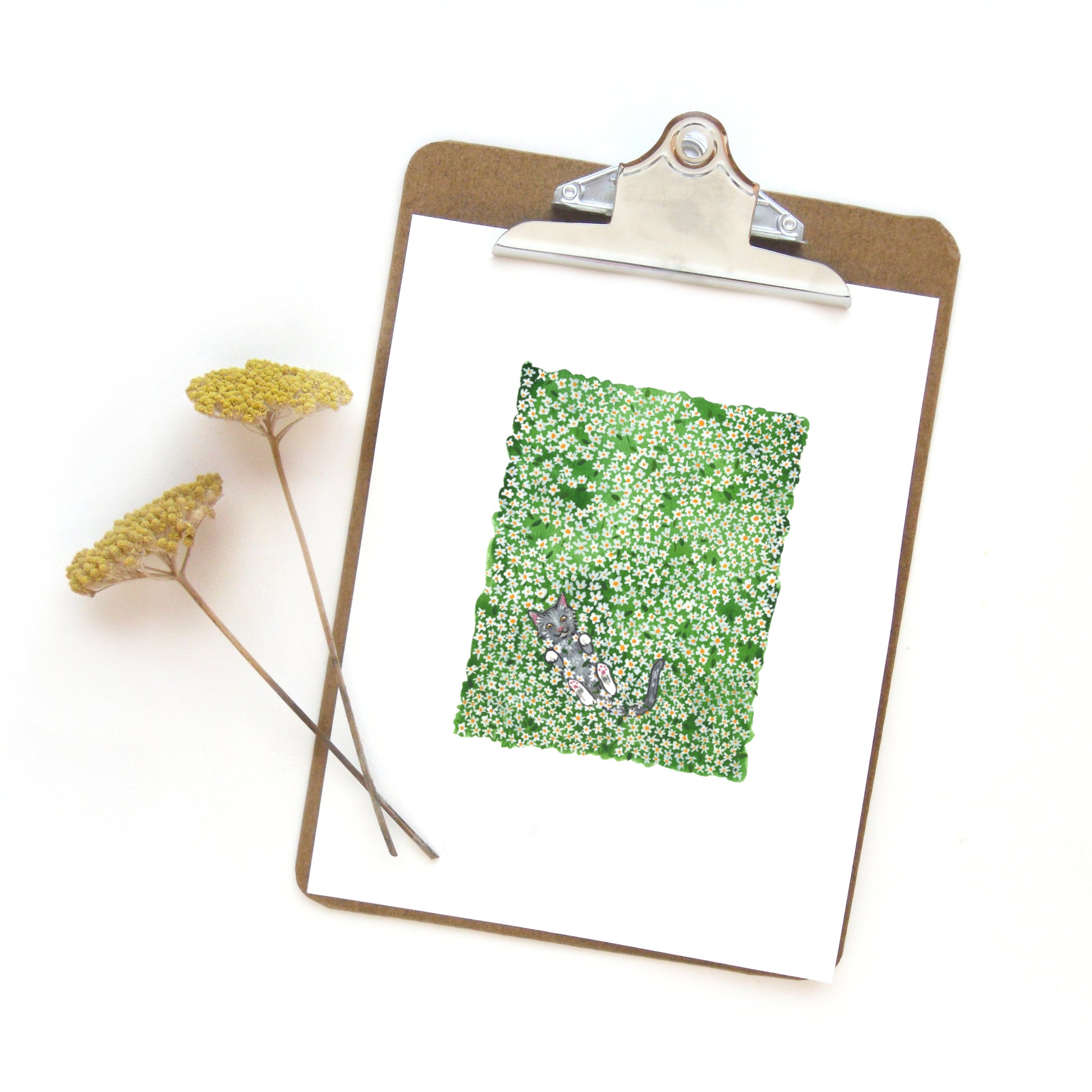 Let your little corner of the world bloom with this oh-so-cute Cat + Flower Field Watercolor Art Print 3! Featuring an adorable grey tabby cat hidden in a field of livin'-it-up daisies, this print will add a touch of purr-fection to your décor!