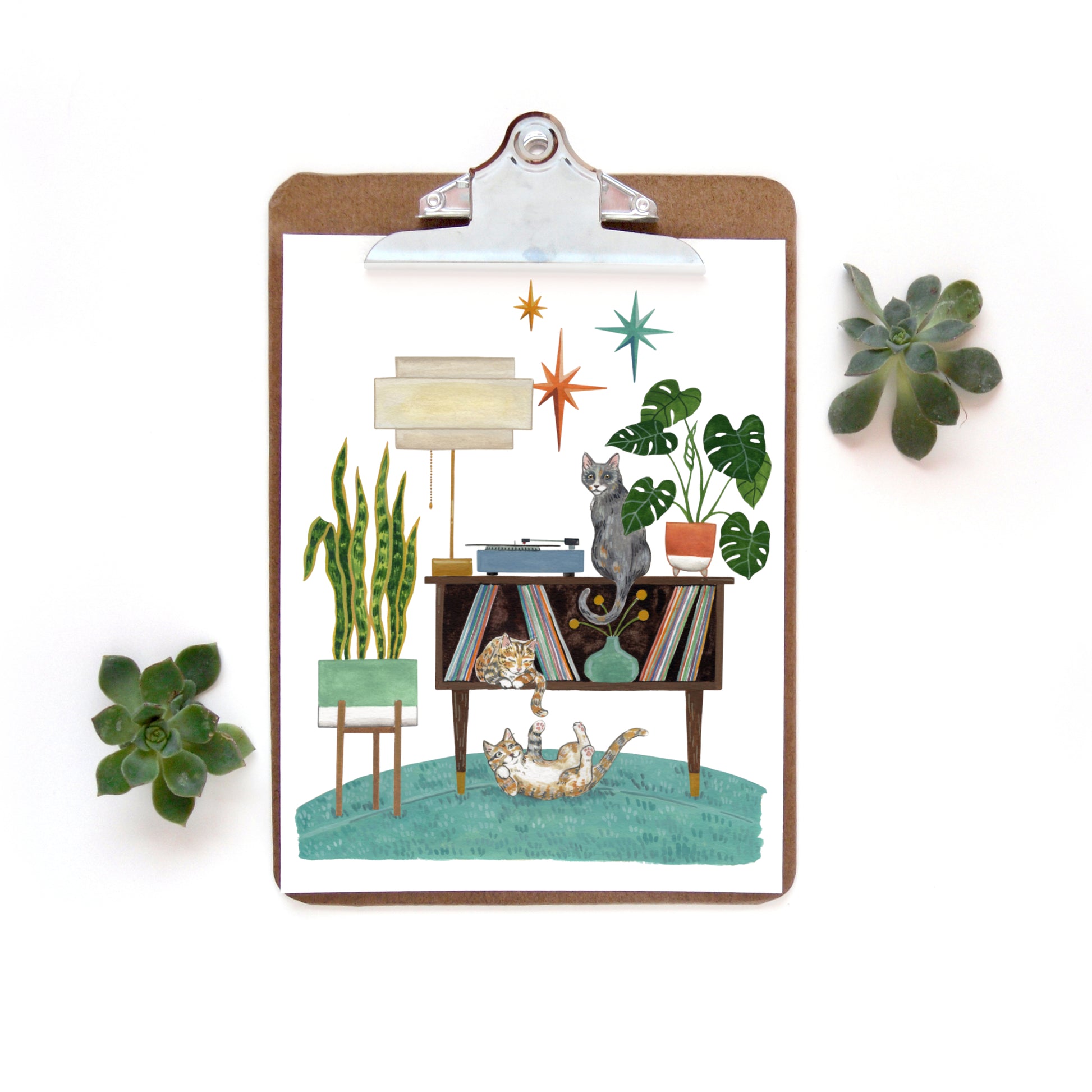 Bring some mid-century modern vibes to your home with the 2nd design in our series of Cats + Plants Watercolor Art Prints! This watercolor illustration has all the retro vibes, from the funky cats to the lush plants surrounding a record table of your dreams. Cats, plants and MCM... what could be better?