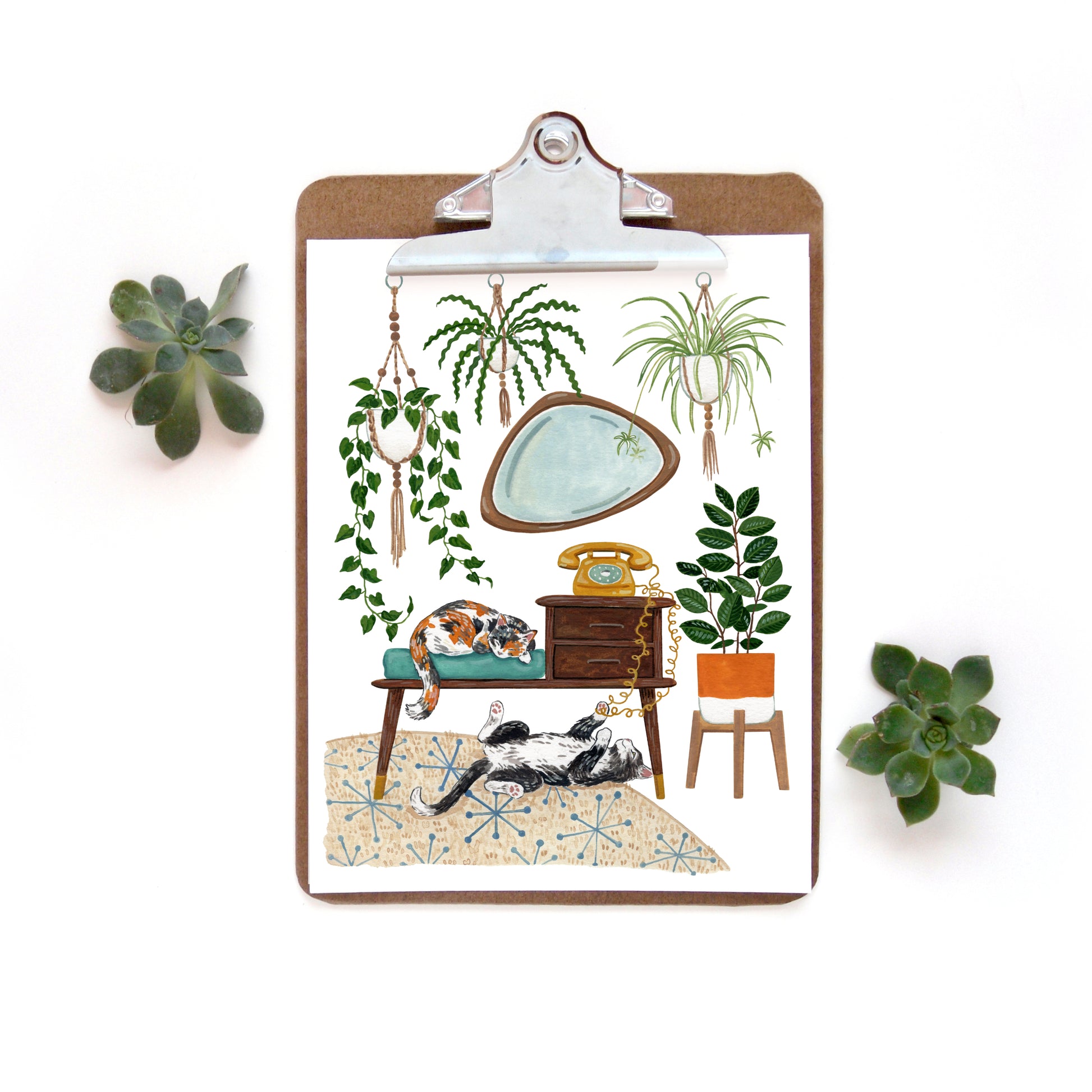 Brighten up your space with this googie mid-century art print! Our Cats + Plants Watercolor Art Print 3 features an eye-catching watercolor illustration that's sure to have your friends meowing in adoration. After all, what's not to love about the perfect blend of cats and plants? Make your place purr-fectly stylish.