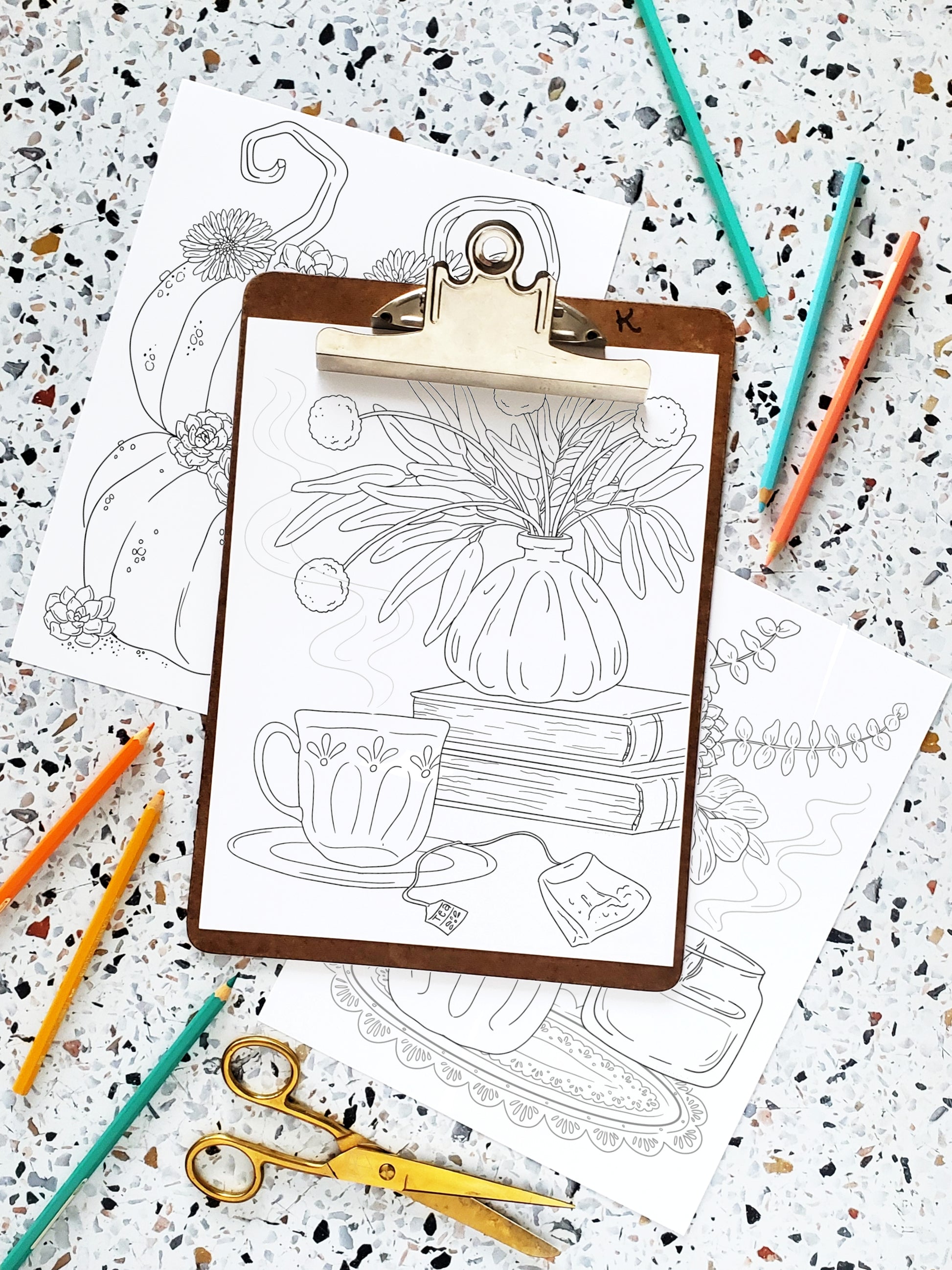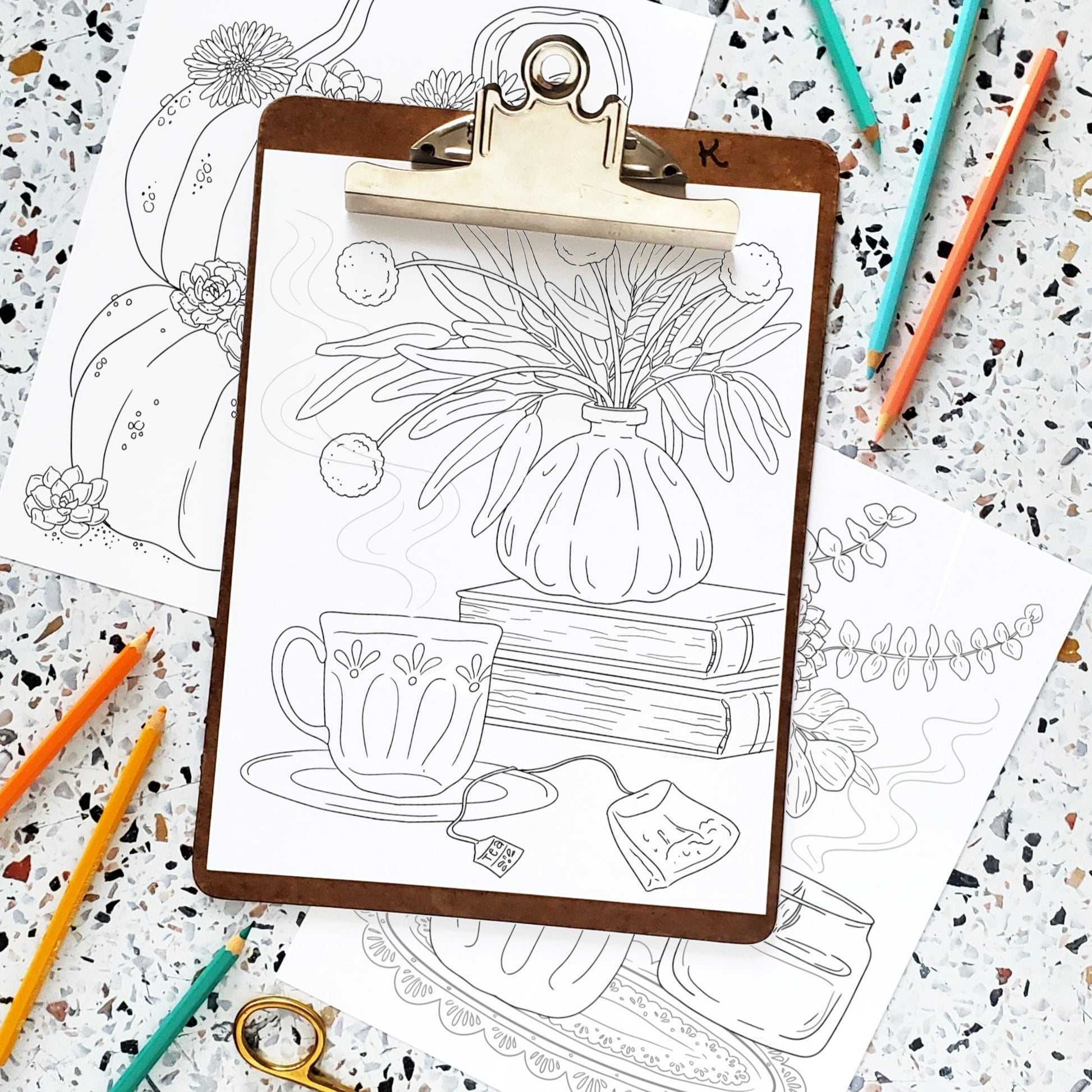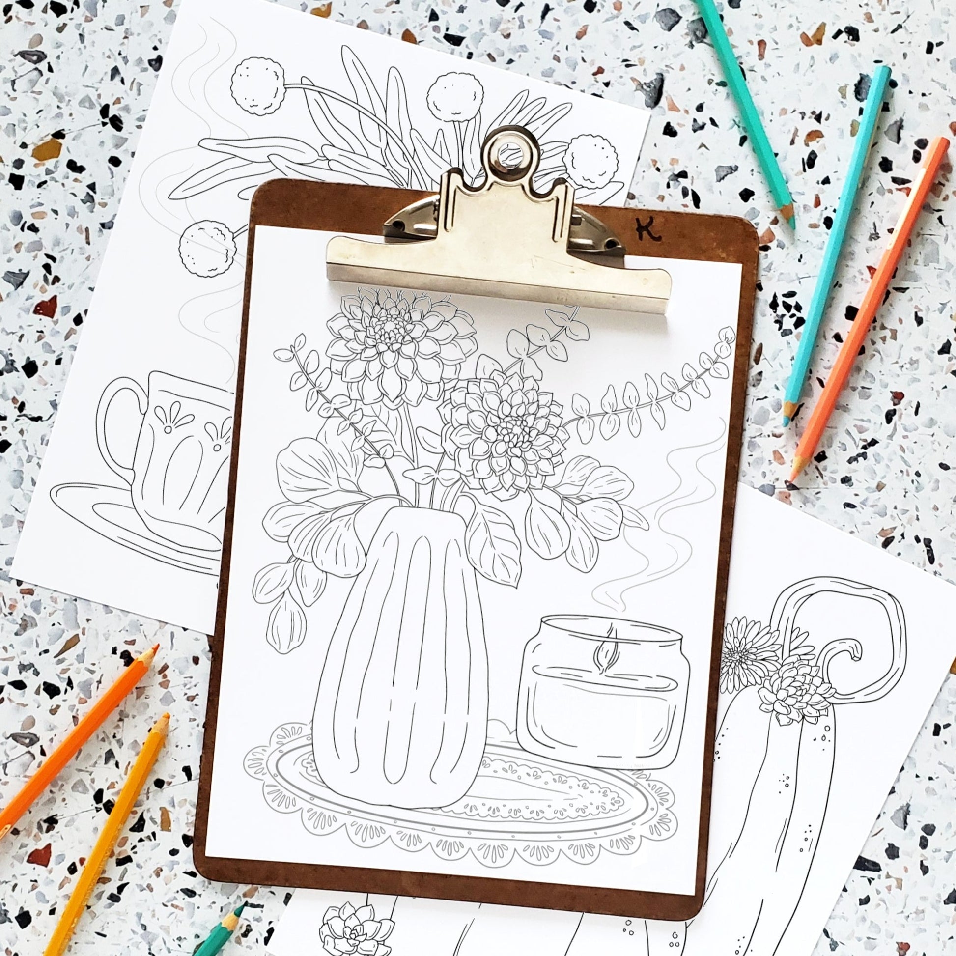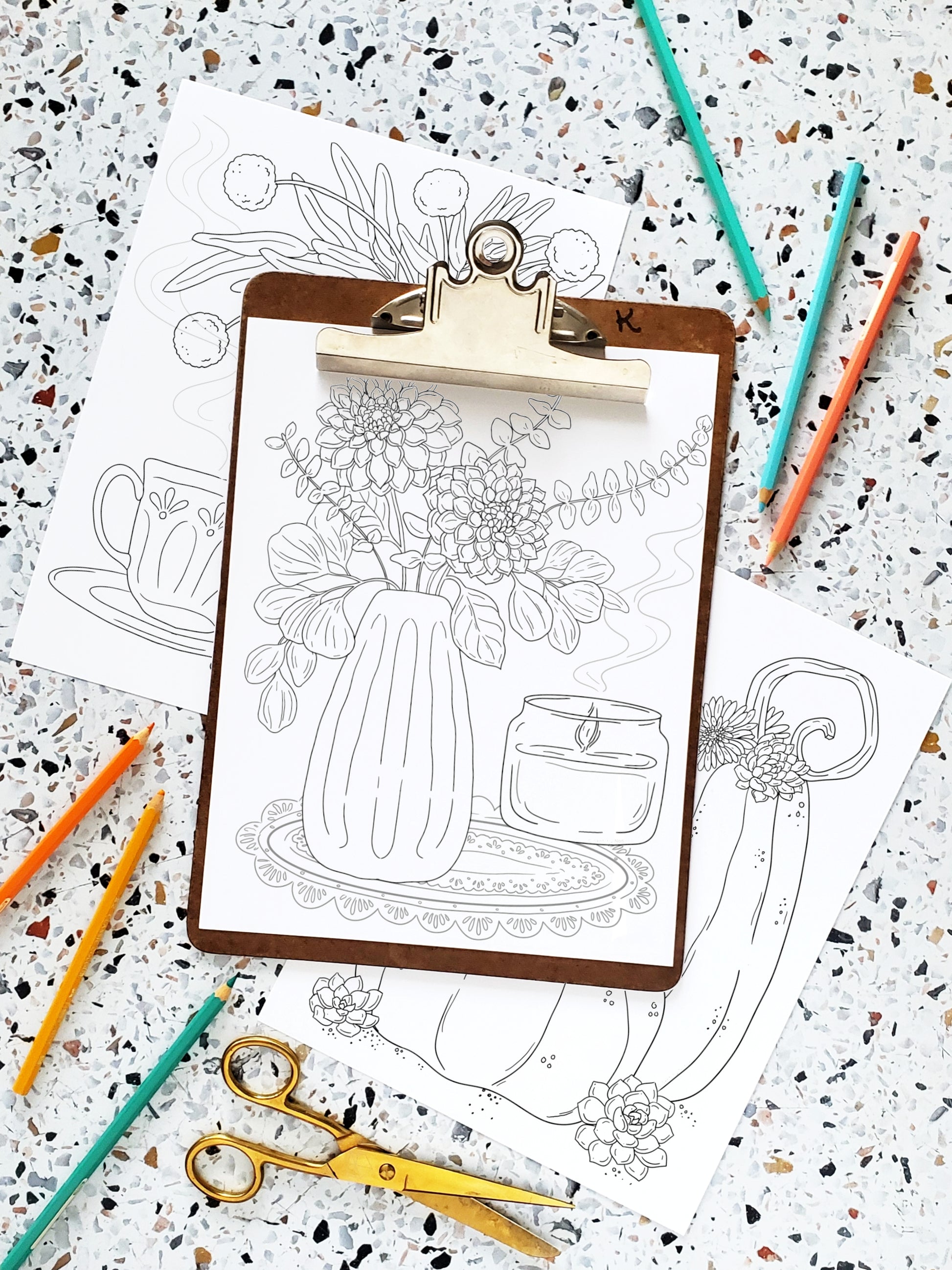 Spice up your fall with a cozy coloring session featuring festive florals and autumnal favorites! With Gerber daisies, succulents, dahlias, eucalyptus, along with some pumpkins, candles, cups of tea and books, this collection of unique bouquets is sure to treat your inner artist to some creative fun. Time for some fall-themed crafting!