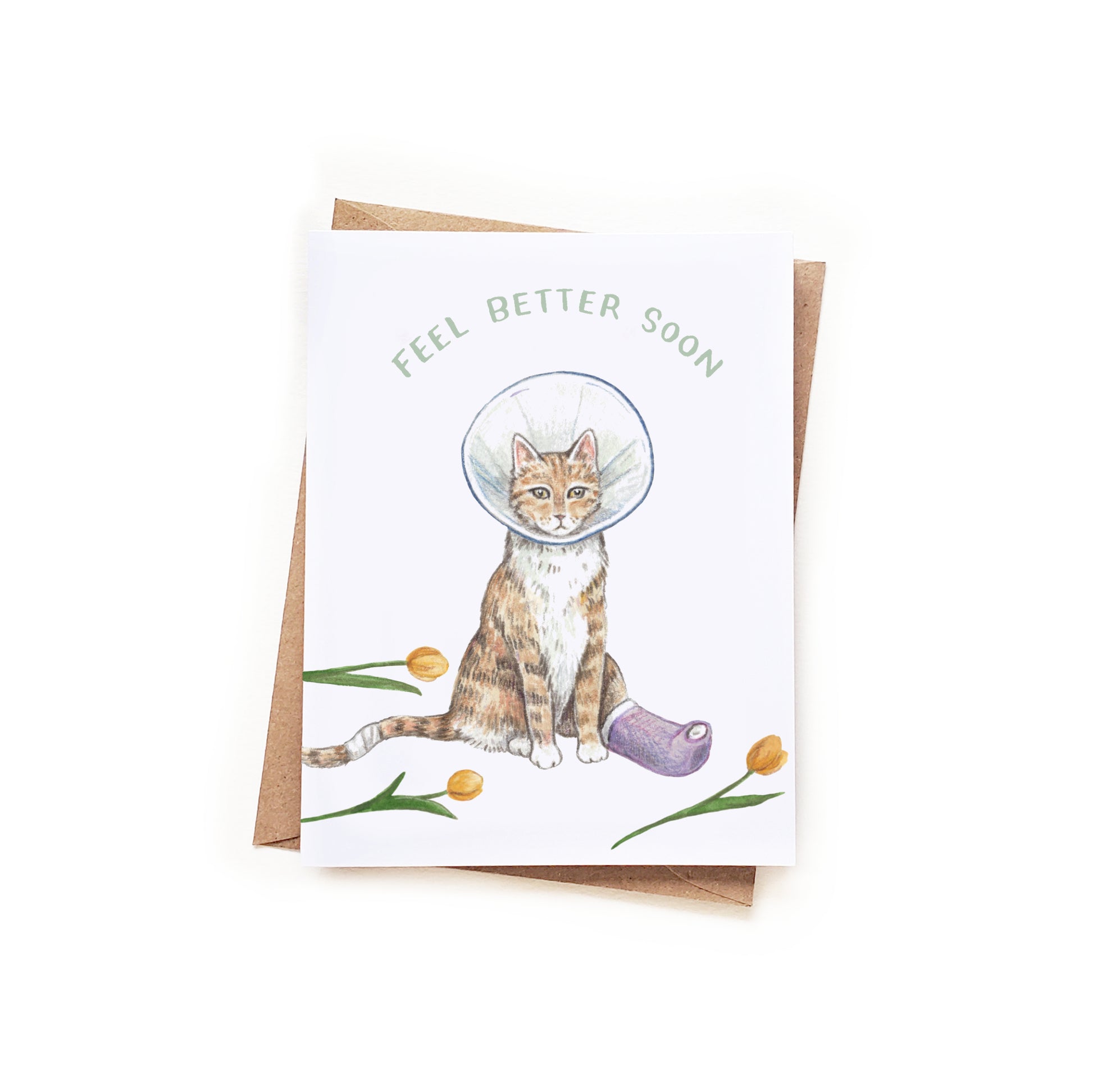 Brighten someone's day with the playful Feel Better Soon Cat Card. Featuring a goofy cat wearing the cone of shame and a cast, near a thoughtful (albeit broken) vase of tulips, this card delivers a fun and heartfelt message to lift spirits and send good vibes.