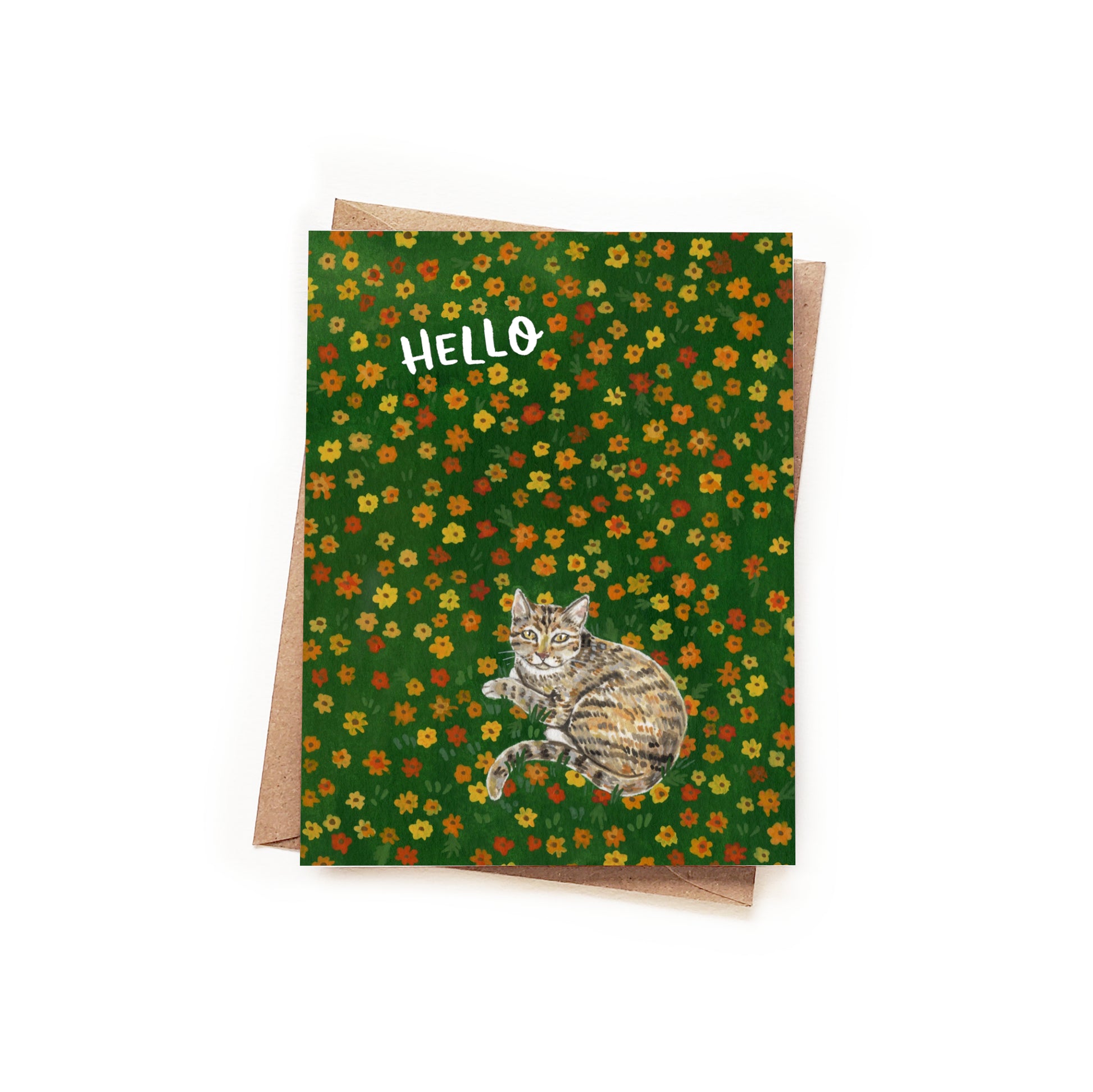 Say "hello" with this delightful card! Featuring a sweet torbie kitten, snuggled up amidst a watercolor field of flowers, it's sure to bring a smile to your recipient's face. So brighten a day and send some cheer - it's purrrfect!