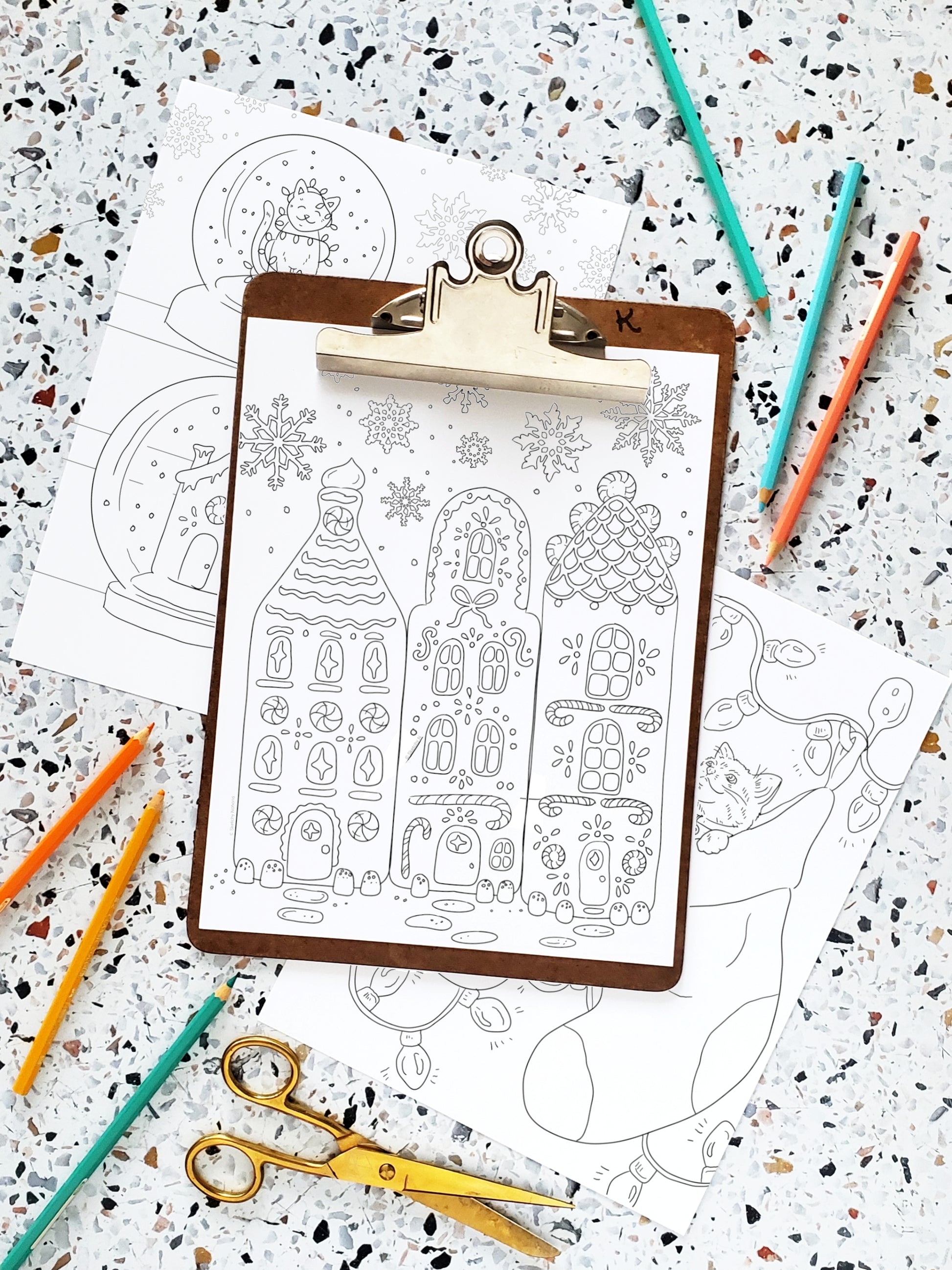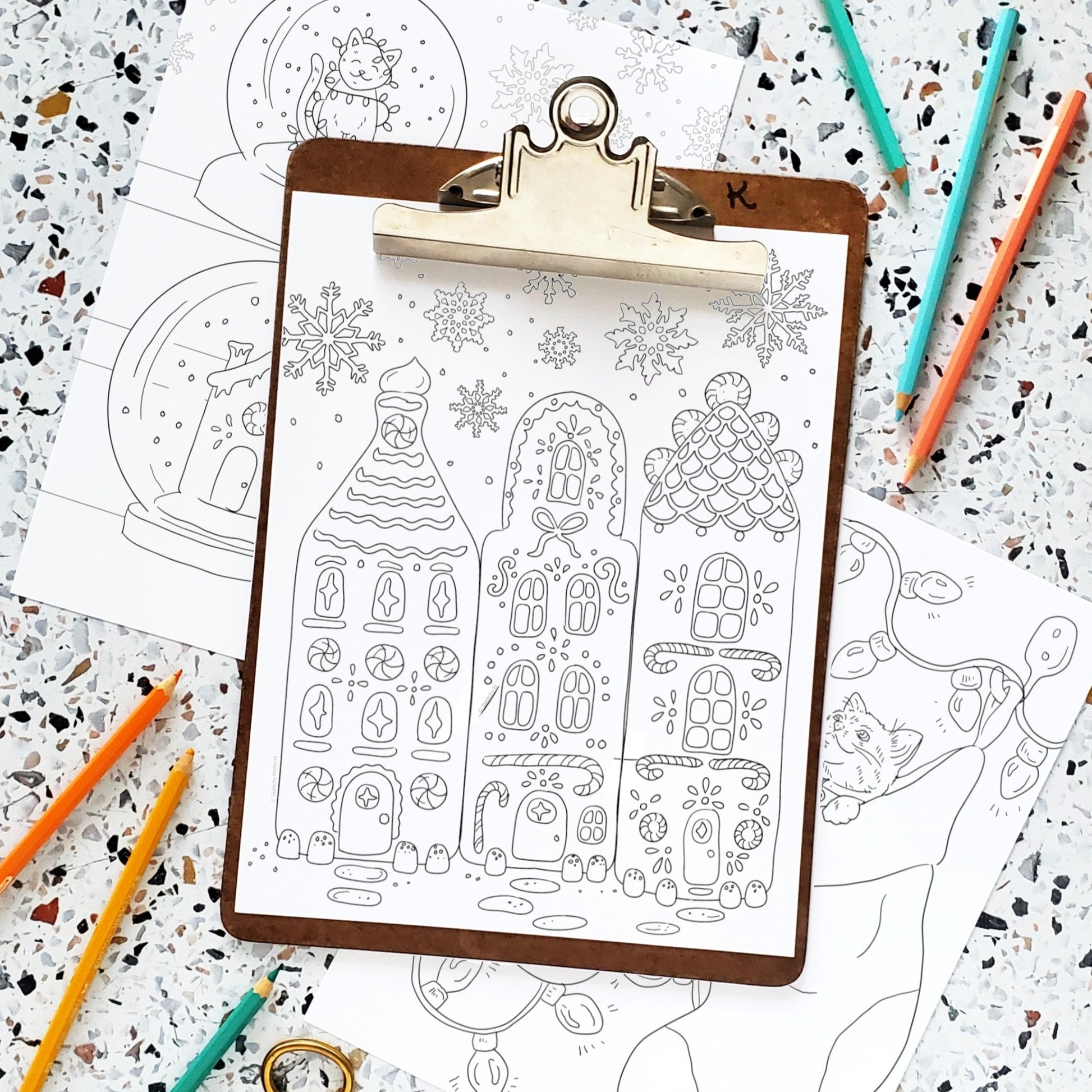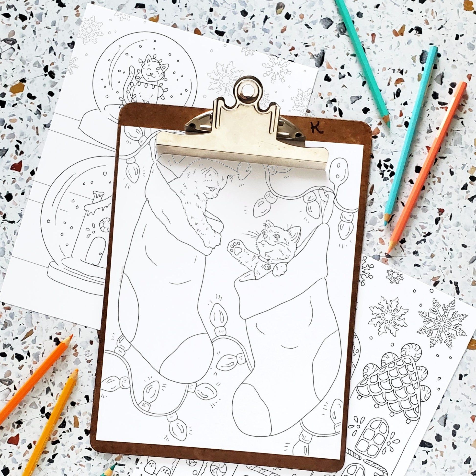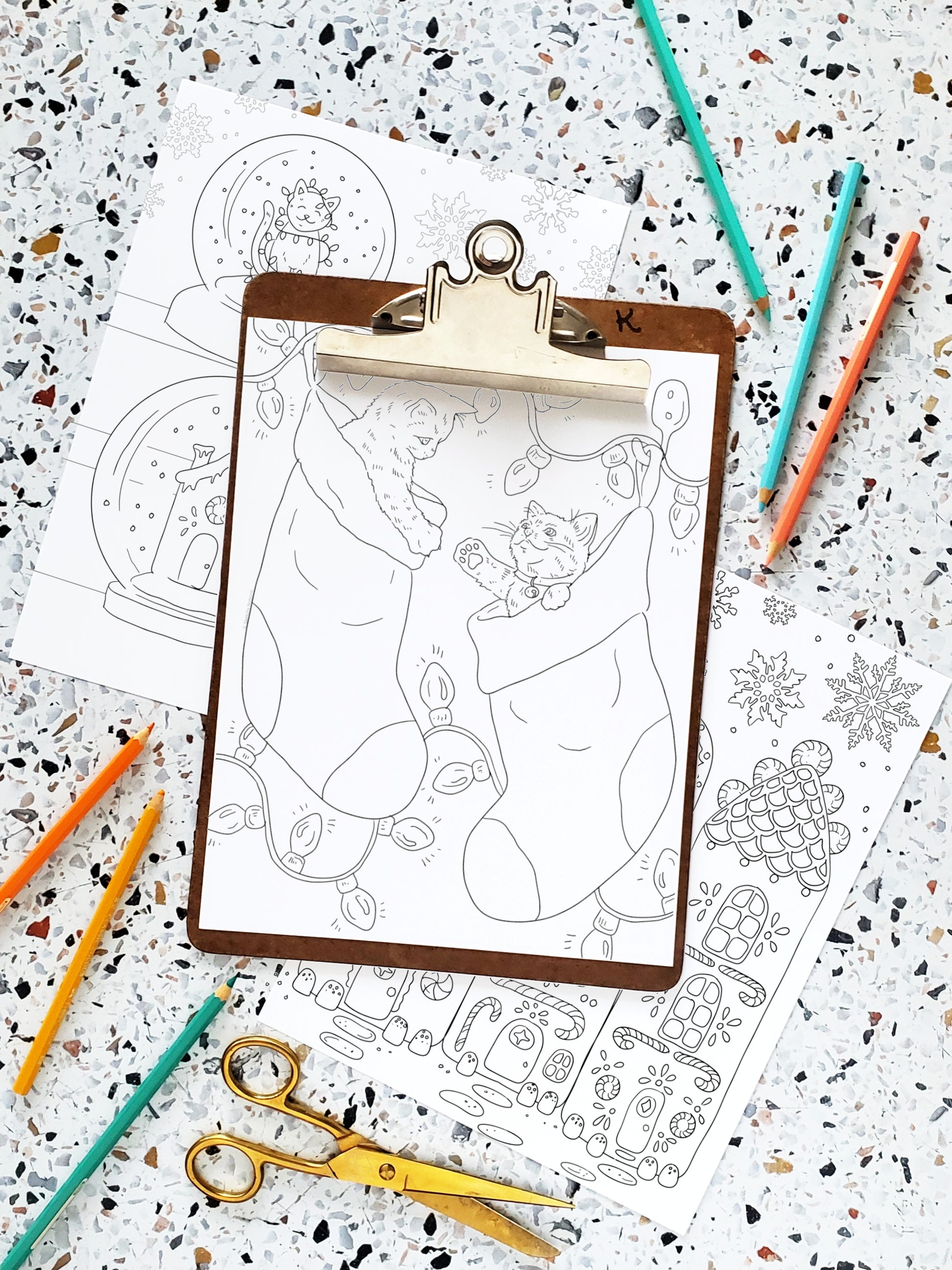 Spread some holiday cheer and enjoy a much deserved coloring break with these hand-drawn holiday decor themed coloring pages! Make your gingerbread houses sparkle, color in some cute stockings with kittens and snow globes, and let your creative juices flow! Get festive and bring the joy back into the holiday season!
