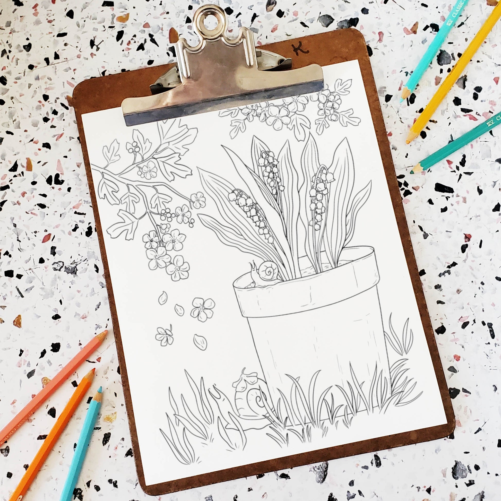 This intricate hand-drawn coloring page features the May birth flowers, Lily of the Valley and Hawthorn, intertwined with sneaky snails. Get ready to add a touch of whimsy to your coloring experience!