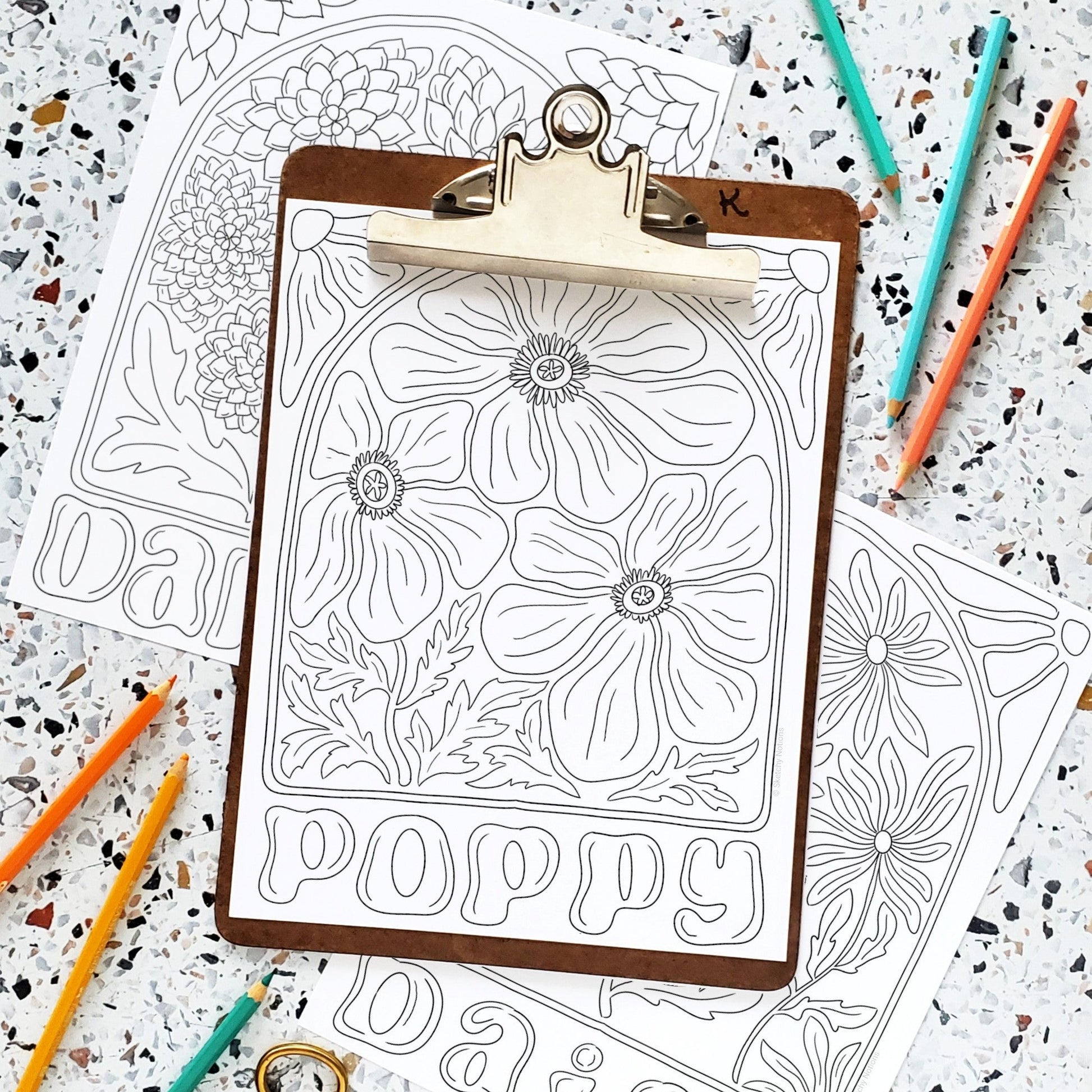 Get funky and floral with our art nouveau-ish flowers, hand-drawn for a unique coloring experience. These stylized flowers include Daisies, Matalija poppies and Dahlias! Perfect for all ages, these printables will bring vibrant life to your imagination!