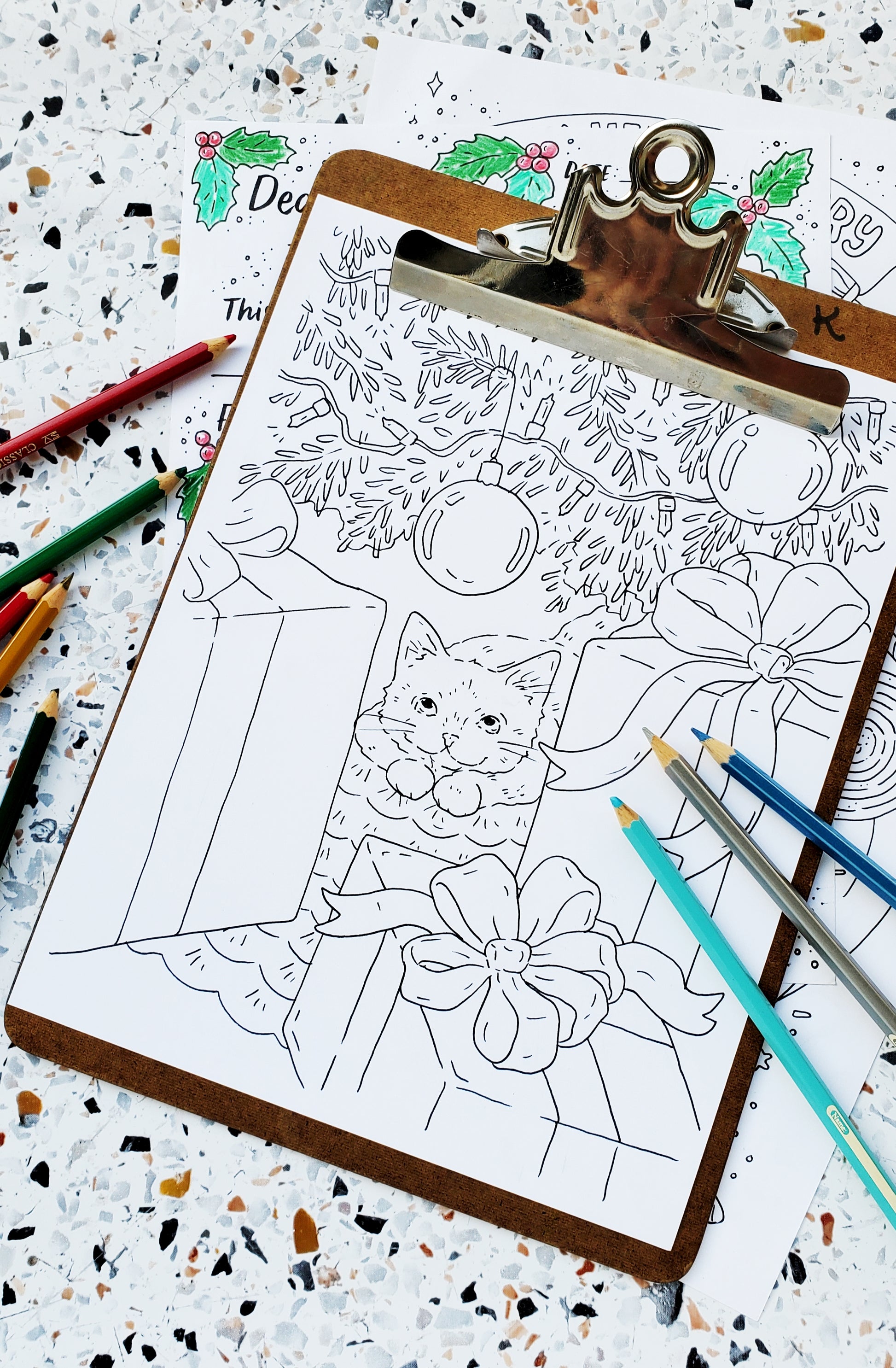 - 3 full page designs of poinsettia, sneaky kitties and holiday treats