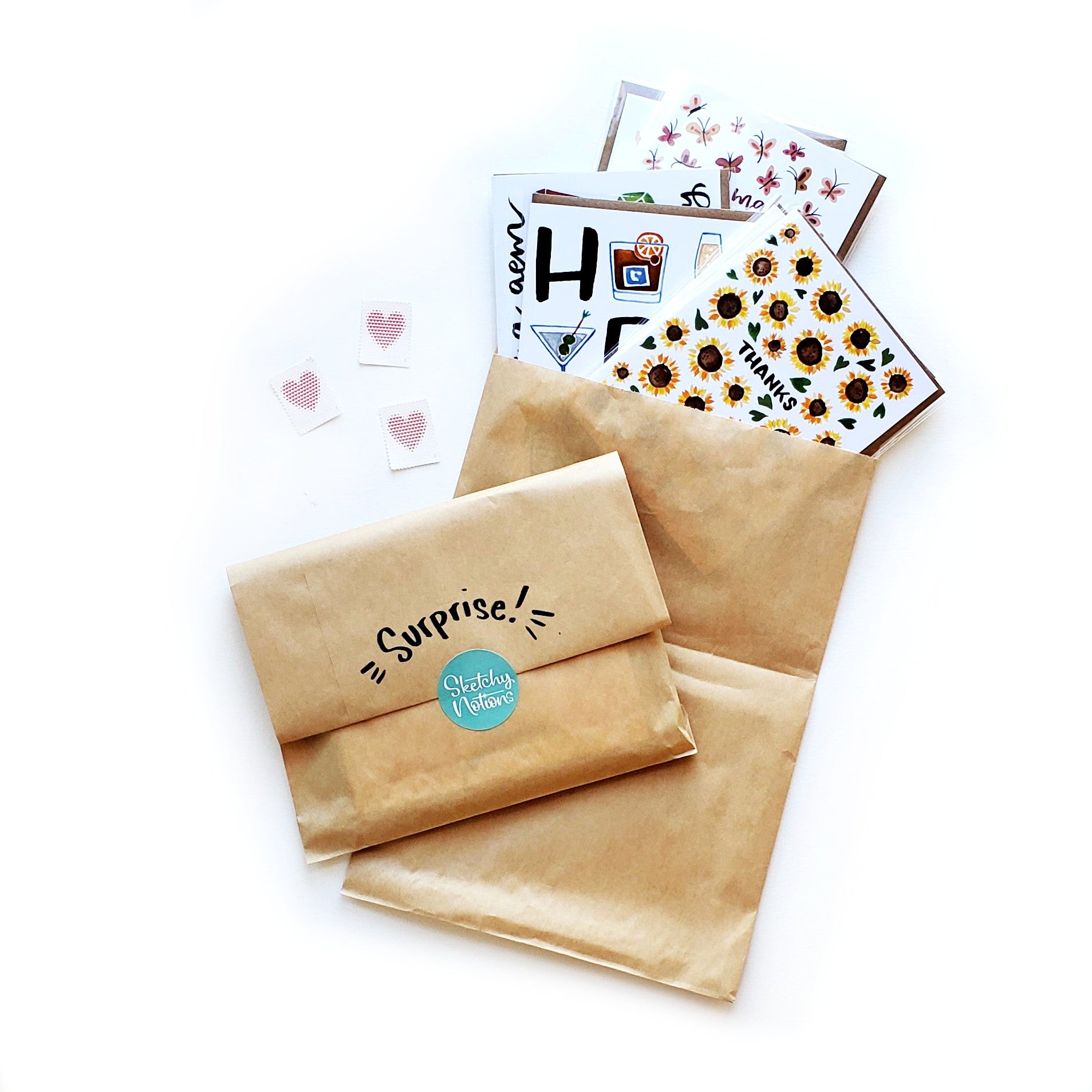Each pack will include: 6 cards and 6 kraft envelopes. (Some include cellophane sleeves but not all). All will be wrapped in a kraft paper envelope.