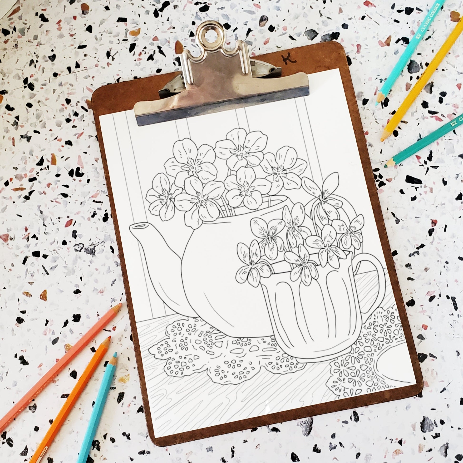 Unleash your creativity with the Violet + Primrose coloring page. This hand-drawn page features a whimsical teapot and teacup adorned with February's birth month flowers - Primroses and Violets. Perfect for a relaxing and fun activity, this coloring page is sure to add a touch of charm to your day.