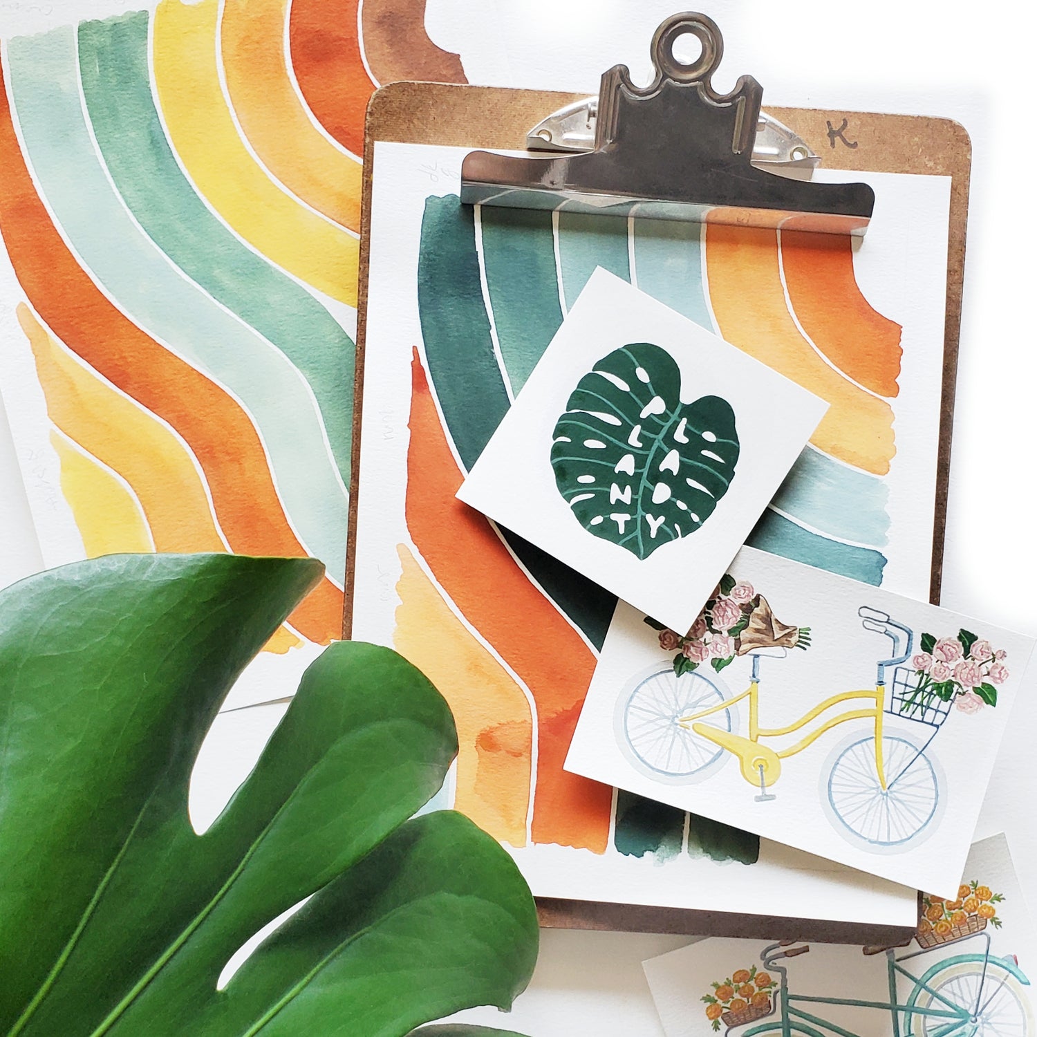 Waterproof, vinyl stickers and enamel pins featuring our original watercolor designs to...